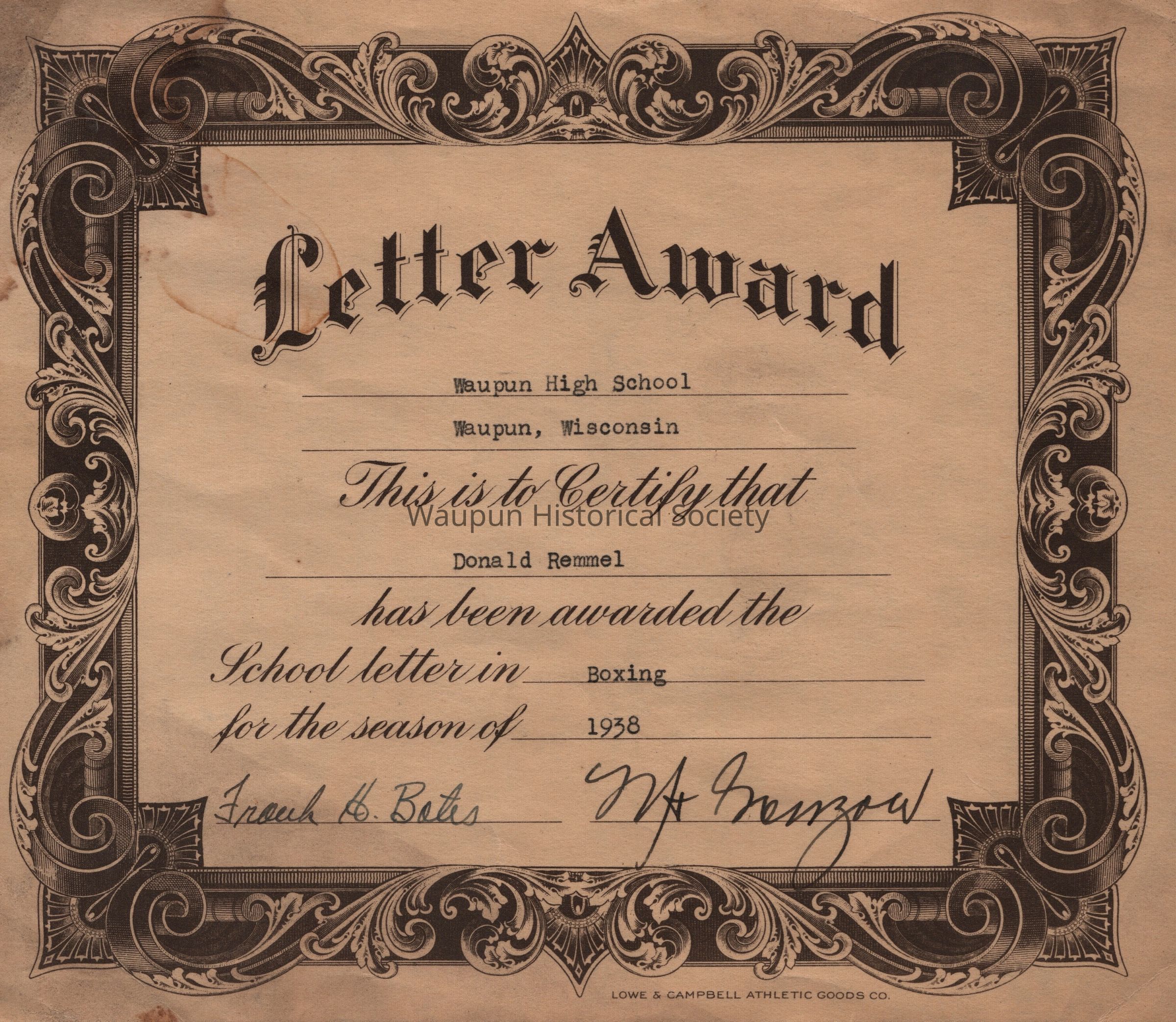 Certificate, Letter Award, 1938 Boxing, Donald Remmel
