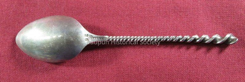 Child's spoon from collection. Sterling silver/gold wash with decorative spiral handle. Engraved in the bowl of the spoon is "Waupun 1891". The back side of the spoon has the word "sterling" and the number 28 at the base of the handle.Acquisition
