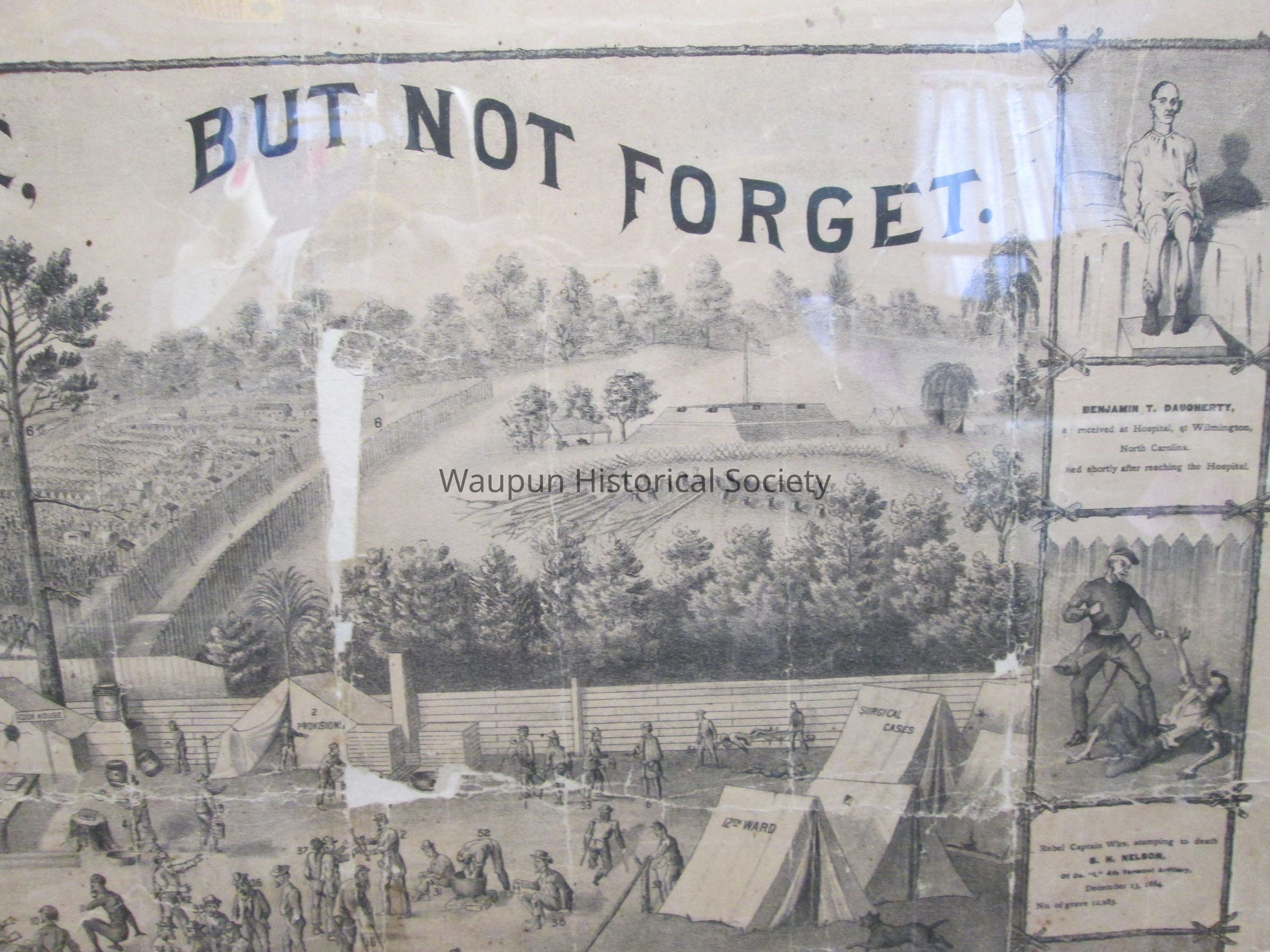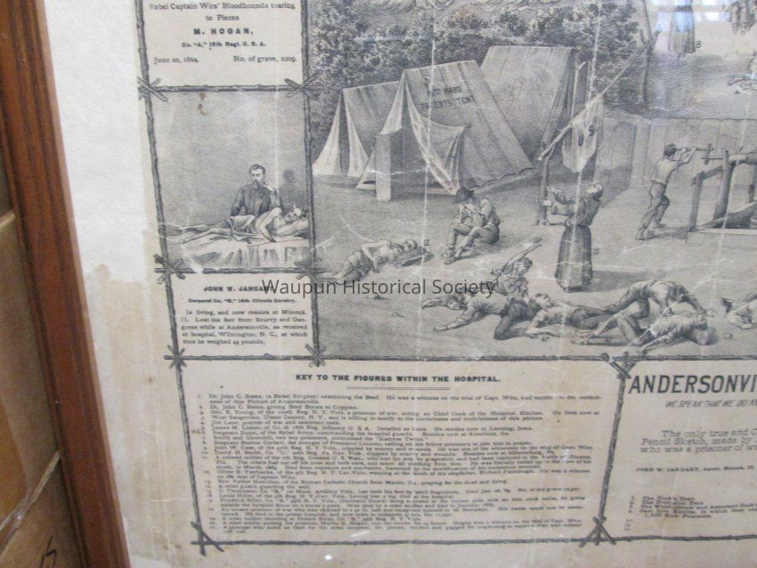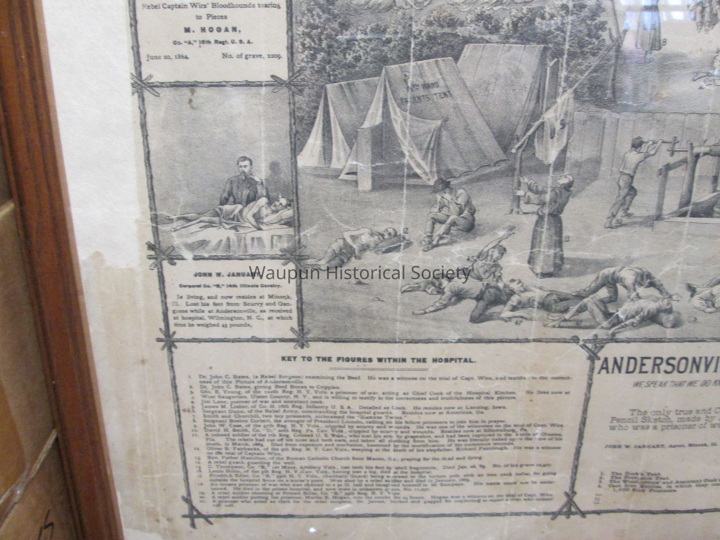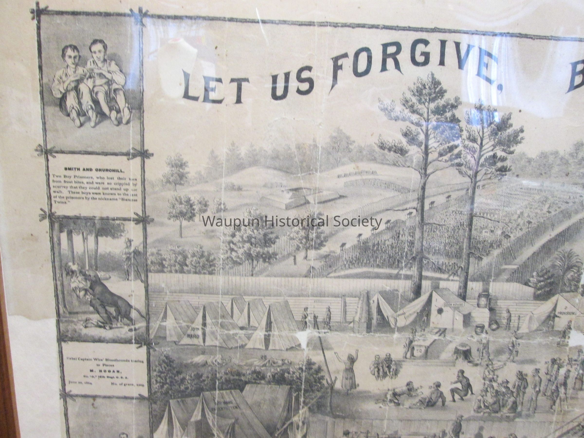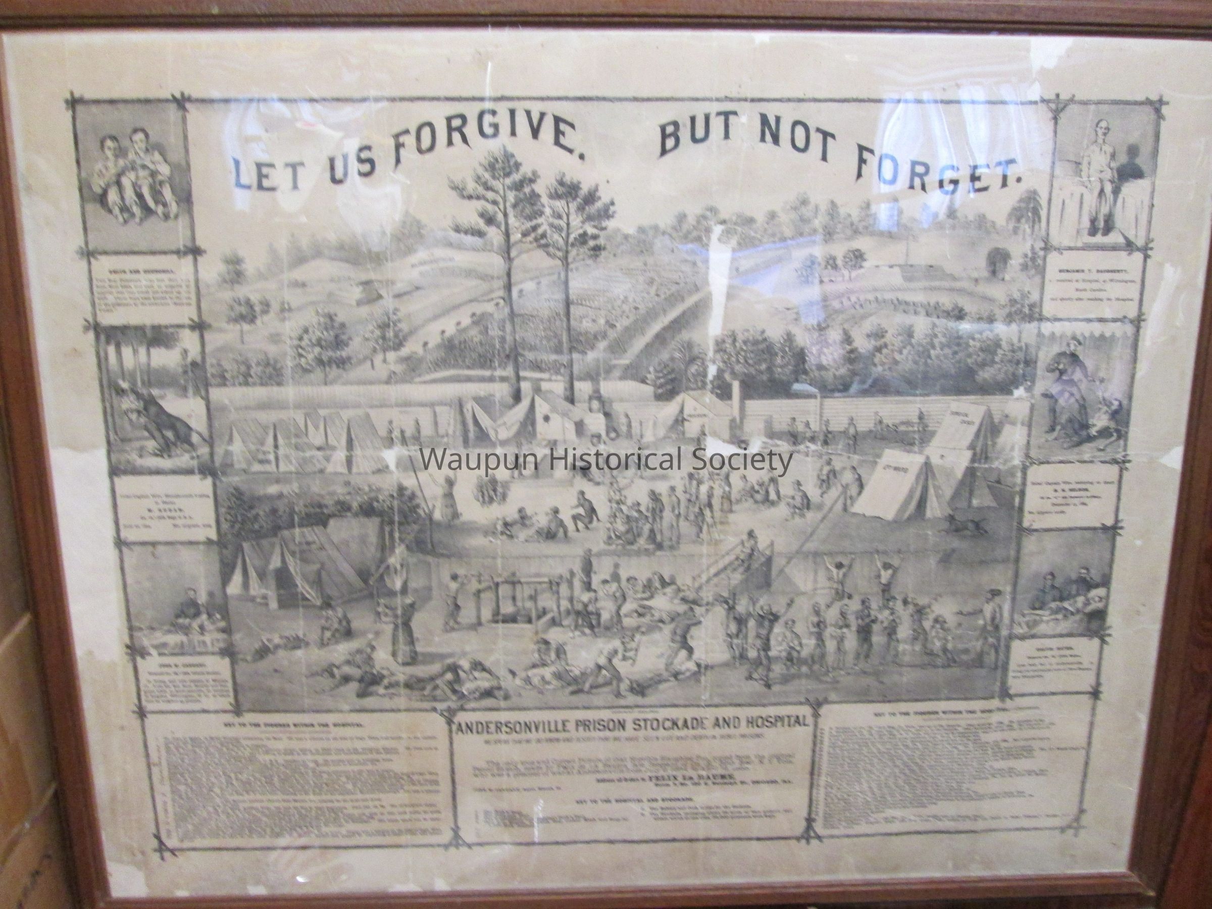 Framed Lithograph of the Andersonville Stockade and Hospital during the Civil War era. "LET US FORGIVE BUT NOT FORGET" printed at top of lithograph. Frame is brown wood and is in ok condition. On left edge of picture are 3 mini stories: Picture of 2 boy prisioners, Smith and Churchhill. They were nicknamed the, "Siamese Twins". Rebel Capt. Wirz; bloodhounds tearing to pieces M. Hogan, Co. A 16th Regt. USA June 20th, 1864. No. of grave, 2209. John W. January Corporale, Co.B 14th Illinois calvary, is living and now resides at Minonk, ILL. lost his feet from scurvy and gangrene while at Andersonville, as recieved at hospital, Wilmington, NC at which time he weighed 45 pounds. On right side of picture there are also 3 mini stories: Benjamin T. Daugherty, recieved at hospital, at Wilmington, North Carolina. Died shortly after reaching the hospital. Rebel Captain Wirz, stamping to death S.H. Nelson, of Co. "I" 4th Vermont artilliary, December 13, 1864. No. of grave 12,283. Calvin Bates Corporal Co. E 20th Main, lost both feet at Andersonville. Is living yet and resides now at New Boston, New Hamshire.