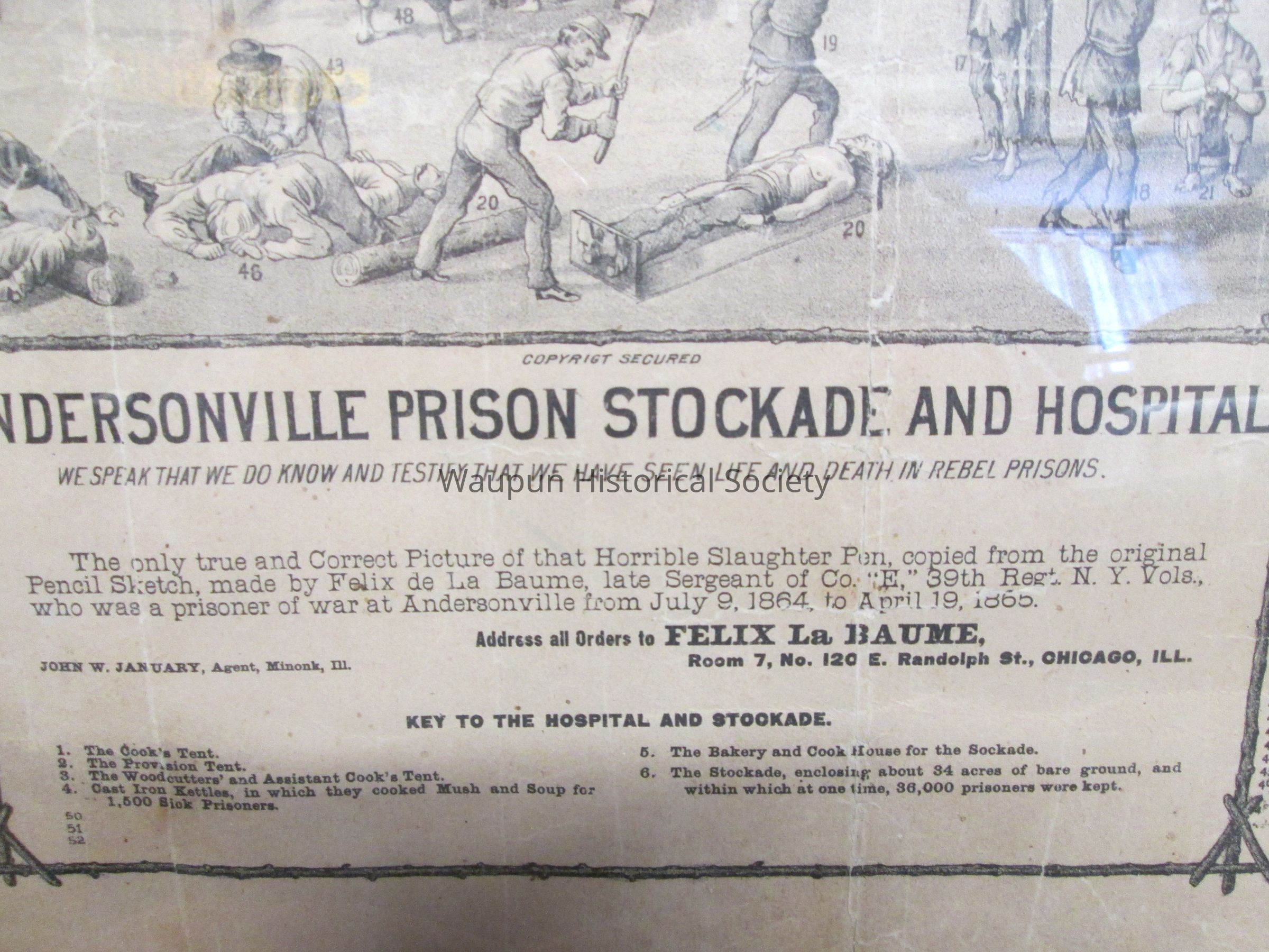 At the bottom left of picture is a section labeled, "Key to the figures within the hospital". 1. Dr. John C. Bates, "a rebel surgeon" examining the beef. He was a witness on the trial of Capt. Wirz, and testified to the correctness of this picture of Andersonville. 2. Dr. John. C. Bates giving beef bones to cripples. 3. George E. Young, of the 120th Reg. N.Y. Vols. a prisoner of war acting as chief cook of the hospital kitchen. He lives now at West Saugerties, Ulster county, N.Y. and is willing to testify to the correctness and truthfulness of this picture. 4. Jim Lane, prisioner of war and assistant cook. 5. James M. Lisher, of Co. "B." 16th Reg. infantry USA detailed as cook. He resides now at Lansing, Iowa. 6. Sergeant Dunn, of the rebel army, commanding the hospital guards. Resides now at Americus, GA. 7. Smith and Churchhill, 2 boy prisioners nicknamed the "Siamese Twins." 8. Sergeant Boston Corbett, the avenger of President Lincoln, calling on his fellow prisioners to join him in prayer. 9. John W. Case, of the 47th Reg. NY Vols., crippled by scurvey and wounds. He was one of the witnesses on the trial of Capt. Wirz. 10. David H. Smith, Co. D, 20th Reg. PA. Cav. Vols., crippled by scurvey and wounds. Resides now at Elliottsburg, PA. 11. A colored soldier of the 7th Reg. colored US Vols, who lost his arm by grapeshot, and had been captured in the battle of Olustee, FLA. The rebels had cut off his nose and both ears and taken all clothing from him. He was literally naked up to the time of his death, in March 1865. Died from exposure and starvation hastened by the mortification of his numerous wounds. 12. Oliver B. Fairbanks, of the 9th Reg. N.Y. Cav. Vols., weeping at the death of his stepfather, Richard Fairclough, he was a witness on the trial of Capt. Wirz. 13. Rev. Father Hamilton, of the Roman Catholic Church from Macon, GA., praying for the dead and dying. 14. A rebel guard guarding the well. 15. C. Thompson, Co. "B," 1st Mass. Artilliary Vols., lost both his feet by shell fragments. Died January 26th, 65. No. of his grave 12,527. 16. Louis Holm, of the 5th Reg. NY Cav. Vols., having lost a leg died at the hospital. 17. Friedrich Edler, Co. "B", 39th N.Y. Vols., (Garibaldi Guard) being screwed to the torture pole with an iron neck collar, for going outside the hospital fence on a nurse's pass. Was shot by a rebel solider and died in January, 1865. 18. An insane prisioner of war who was chained to a 50 lb. ball and imagined himself to be Sampson. His name could not be ascertained. He died in the prison hospital, and now rests in unknown grave, No. 11,237. 19. A rebel soldier shooting private Edler, Co. "B", 39th Reg. N.Y. Vols. 20. A rebel soldier putting the prisioner, Martin E. Hogan, into the stocks for 24 hours. Hogan was a witness on the trial of Capt. Wirz. 21. A Prisioner who acted as clerk for the rebel surgeon, Dr. James, bucked and gagged for neglecting to report a man who missed roll call. In the center of the bottom of the picture labeled, "Andersonville Prison Stockade and Hospital", it describes the picture and has the Key to the Hospital and Stockade. We speak that we know and testify that we have seen life and death in rebel prisons. The only true and correct picture of that horrible slaughter pen, copied from the original pencil sketch, made by Felix de La Baume, late Sergeant of Co. "E," 39th Reg. N.Y. Vols., who was a prisioner of war at Andersonville from July 9, 1864 to April 19, 1865.