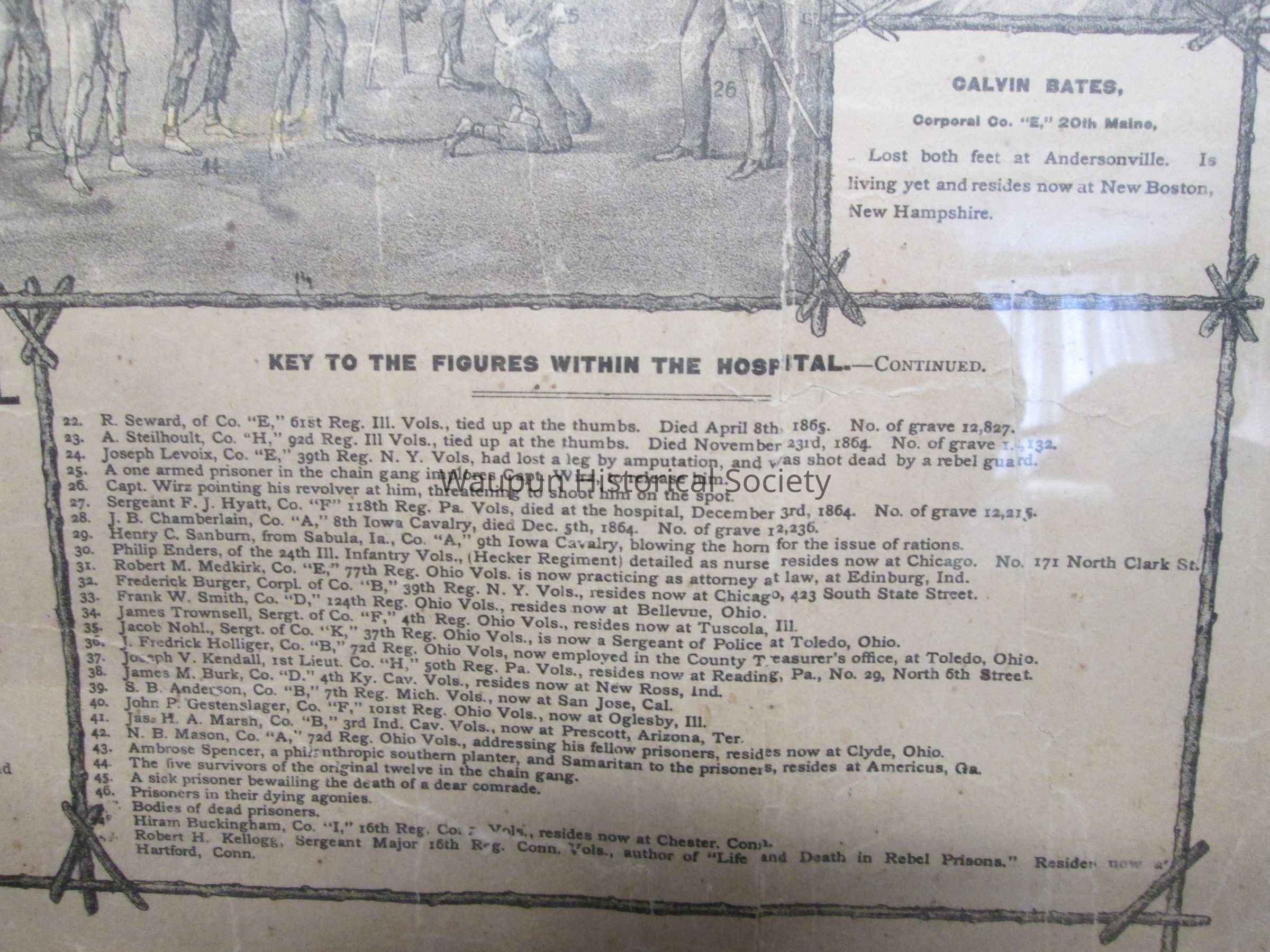 22. R. Seaward, of Co. "E," 61st Reg. ILL. Vols. tied up at the thumbs. Died April 8th, 1865. No. of grave 12,827. 23. A. Steilhoult, Co. "H," 92nd Reg. ILL Vols., tied up at the thumbs. Died November 23rd, 1964. No. of grave 12,132. 24. Joseph Levoix, Co. "E," 39th Reg. N.Y. Vols, had lost a leg by amputation, and was shot dead by a rebel guard. 25. A one armed prisioner in the chain gang implores Capt. Wirz, to release him. 26. Caapt. Wirz pointing his revolver at him, threatening to shoot him on the spot. 27. Sergeant F.J. Hyatt, Co. "F," 118th Reg. Pa. Vols, died at the hospital, December 3rd, 1864. No. of grave 12,215. 28. J.B. Chamberlain, Co. "A," 8th Iowa Cavalry, died Dec. 5th, 1864. No. of grave 12,236. 29.Henry C. Sanburn, from Sabula, Ia., Co. "A," 9th Iowa Cavalry, blowing the horn for the issue of rations. 30. Philip E. Enders, of the 24th ILL. Infantry Vols., (Hecker Regiment) detailed as nurse resides now at Chicago. No. 171 North Clark St. 31. Robert M. Medkirk, Co. "E," 77th Reg. Ohio Vols. is now practicing as attorney at law, at Edinburg, Ind. 32.Frederick Burger, Corpl. of Co. "B," 39th Reg. N.Y. Vols., resides now at Chicago, 423 South State Street. 33. Frank W. Smith, Co. "D," 124th Reg. Ohio Vols., resides now at Bellevue, Ohio. 34. James Trownsell, Sergt. of Co. "F," 4th Reg. Ohio Vols., resides at Tuscola, ILL. 35. Jacob Nohl., Sergt. of Co. "K," 37th Reg. Ohio Vols., is now a Sergeant of Police at Toledo, Ohio. 36. J. Fredrick Holliger, Co. "B," 72nd Reg. Ohio Vols., now employed in the County Treasurer's office, at Toledo, Ohio. 37. Joseph V. Kendall, 1st Lieut. Co. "H," 50th Reg. Pa. Vols., resides now at Reading, Pa, No. 29, North 6th Street. 38. James M. Burk, Co. "D," 4th Ky. Cav. Vols., resides now at New Ross, Ind. 39. S.B. Anderson, Co. "B," 7th Reg. Mich. Vols., now at San Jose, Cal. 40. John P. Gestenslager, Co. "F," 101st Reg. Ohio Vols., now at Oglesby, ILL. 41. Jas. H. A. Marsh, Co "B," 3rd Ind. Cav. Vols. now at Prescot, Arizona, Ter. 42. N. B. Mason, Co. "A," 72ns Reg. Ohio Vols., addressing his fellow prisoners, resides now at Clyde, Ohio. 43. Ambrose Spencer, a philenthropic southern planter, and Samaritan to the prisoners, resides at Americus, Ga. 44. The five survivors of the original twelve in the chain gang. 45. A sick prisioner bewailing the death of a dear comrade. 46. Prisoners in their dying agonies. 47. Bodies of dead prisoners. 48. Hiram Buckingham, Co. "I," 16th Reg. Conn. Vols., resides now at Chester, Conn. 49. Robert H. Kellogg, Sergeant Major 16th Reg. Conn. Vols., author of "Life and Death in Rebel Prisons." Resides now at Hartford, Conn.Acquisition