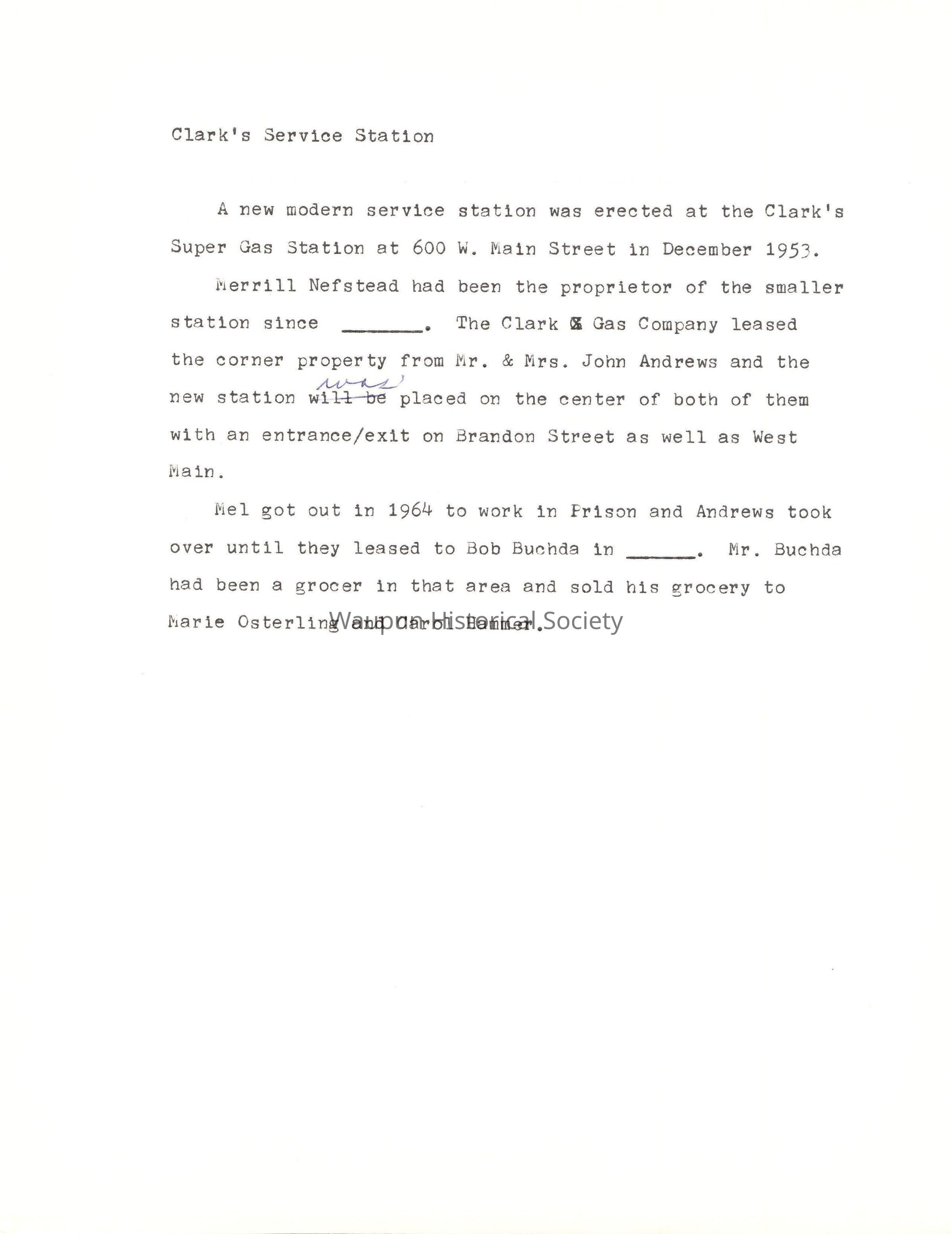 Historical information on the Clark's Service Station for 1976 Bicentennial Celebration in Waupun, WI