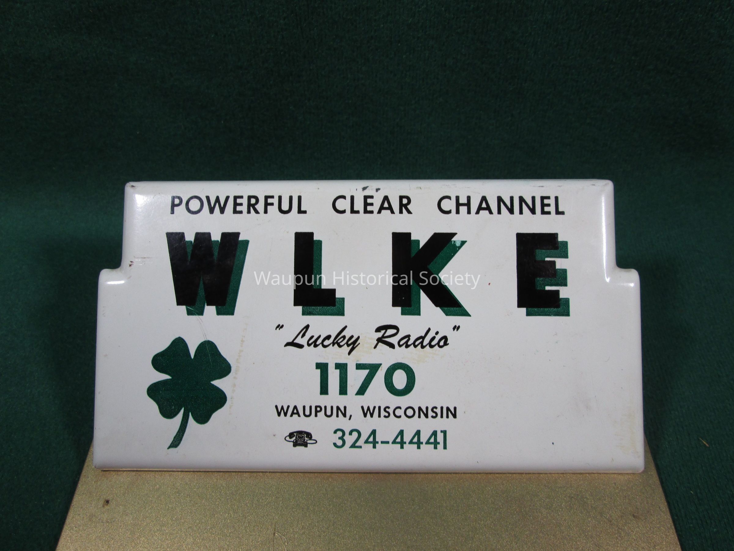 Clipboard advertising W L K E Powerful Clear Channel, "Lucky Radio" 1170 Waupun, Wisconsin, 324-4441. There is a 4-leaf clover painted on the front of the clip portion. The "board" is gold in color and has a felt green backing.Acquisition