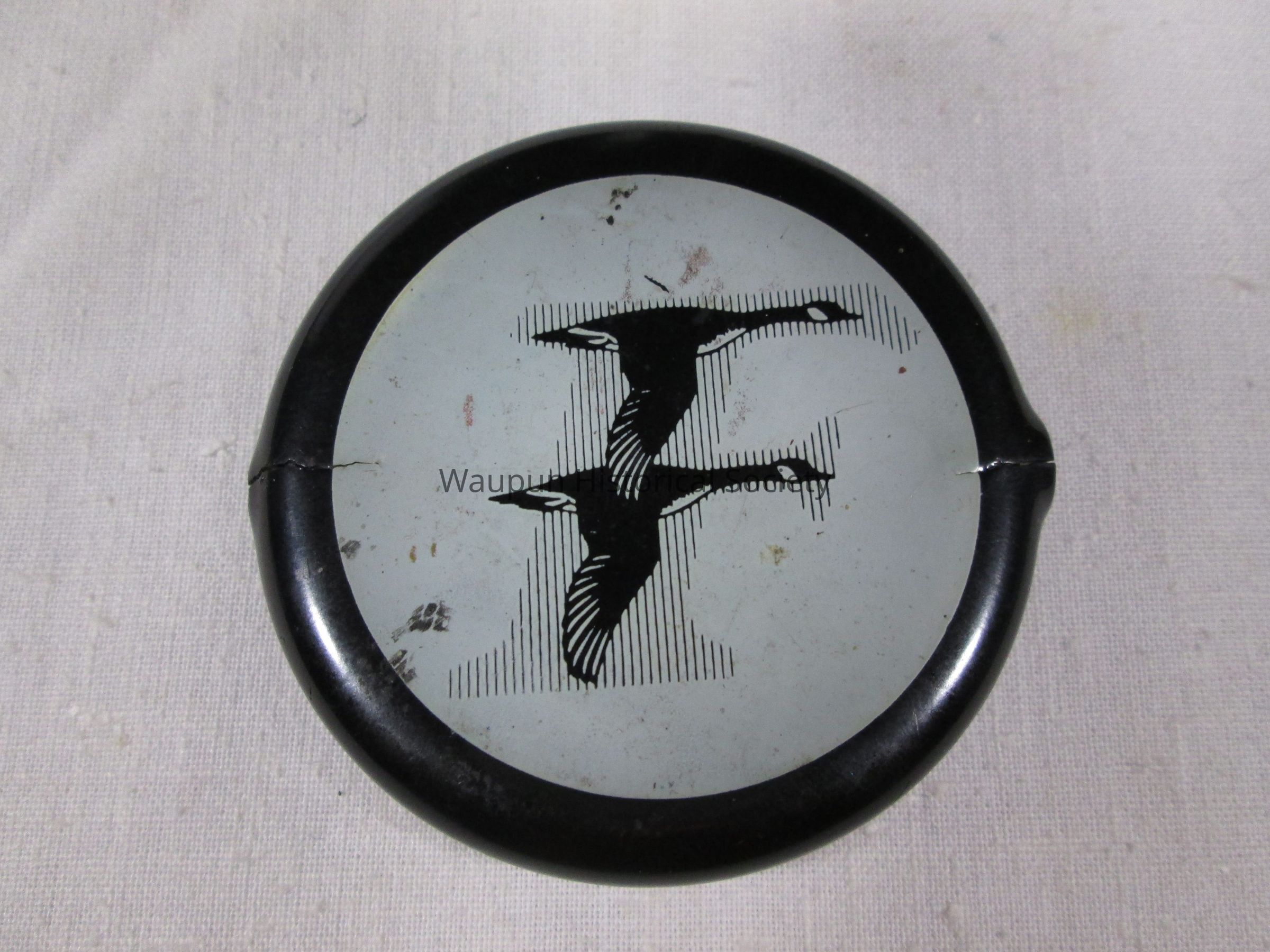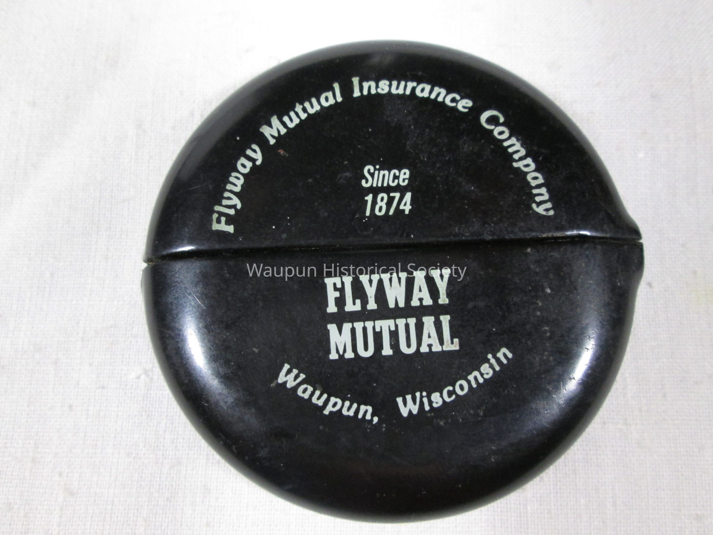 Plastic coin holder, round and black in color. Advertisement for Flyway Mutual Insurance Company since 1874, Waupun, Wisconsin. To open, have to squeeze on both sides. The back shows 2 geese in flight.Acquisition