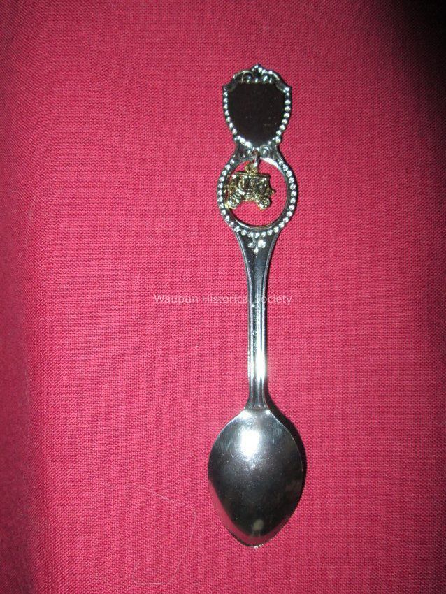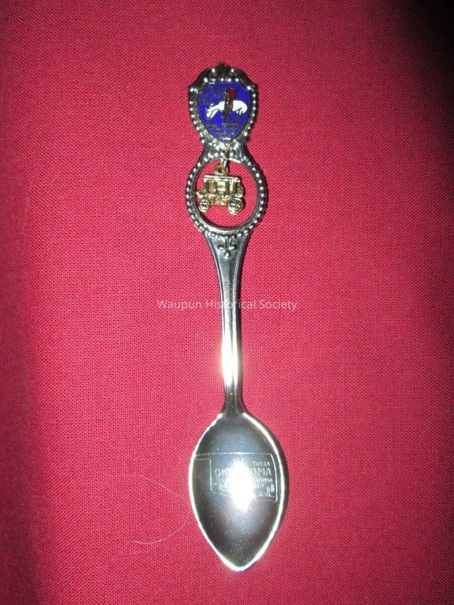 Spoon from collection. Stainless steal souvenir spoon is from The National Cowboy Hall of Fame, Oklahoma. Features the state engraved on the bowl with Tulsa and Oklahoma City, a cowboy hat and oil rigs engraved on it. The top of the handle shows the "End of The Trail" statue, white and red on a blue back ground with "Natl. Cowboy Hall of Fame". Below the emblem is a round opening with a dangling gold color stagecoach charm. The back side of the spoon is plain with indentions that were made to form the front side decoration.Acquisition