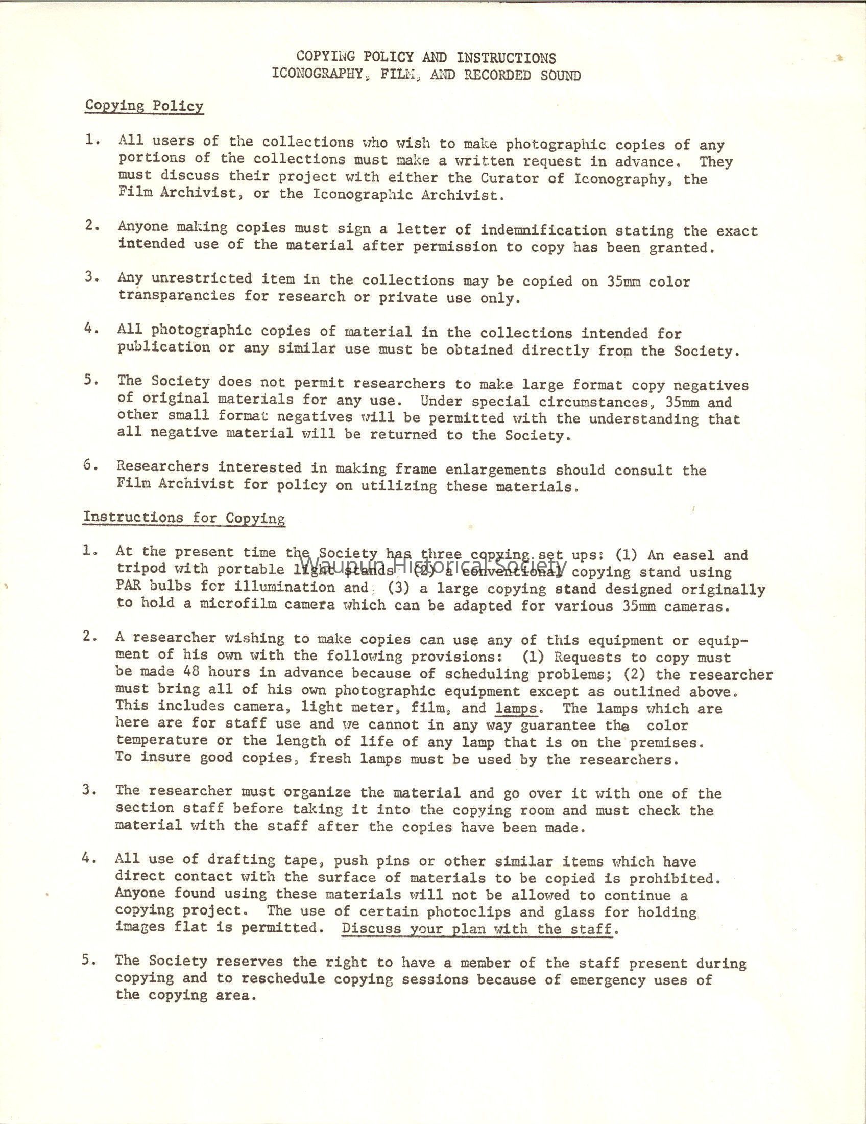 Waupun Historical Society, Copying Policy and Instructions of Iconography FilmEntry/Object ID