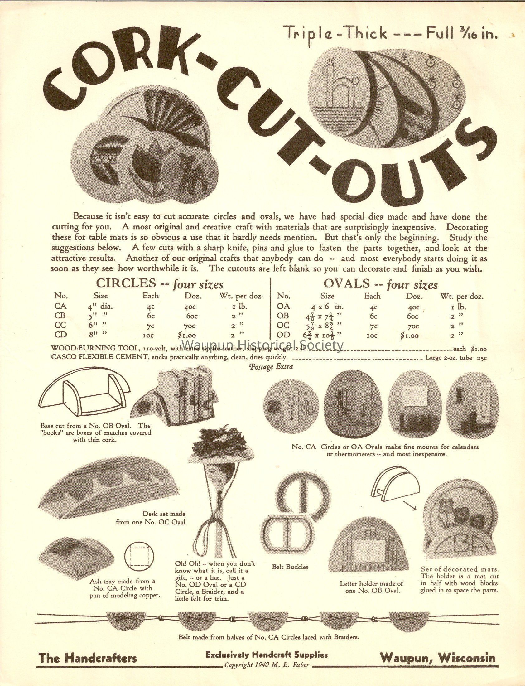 A single page brochuer issued by "The Handcrafters" of Waupun, announces the availability of die cut cork circles and ovals. Pricing and sizes are shown. Suggested projects and additional products are available to purchase .Acquisition