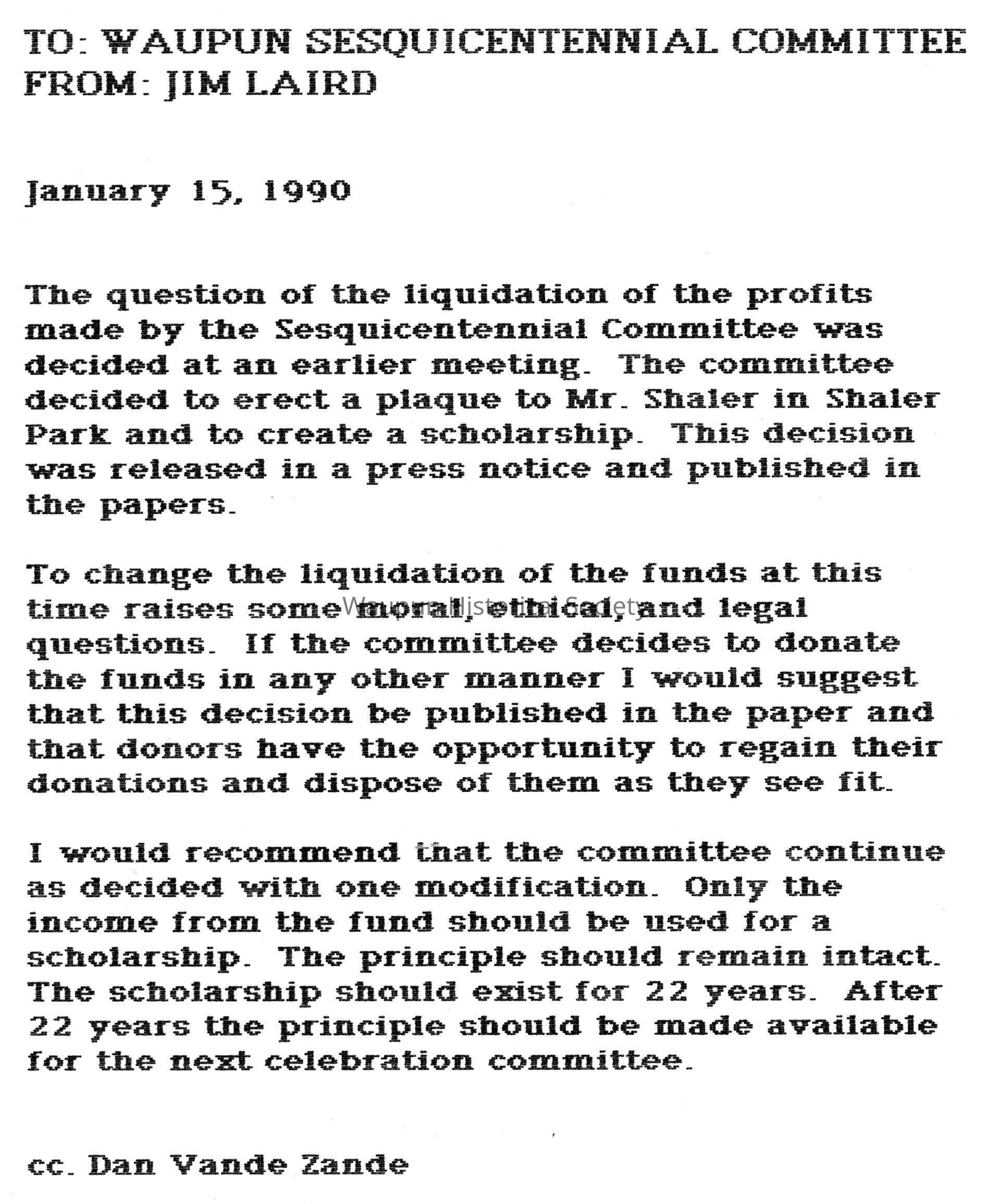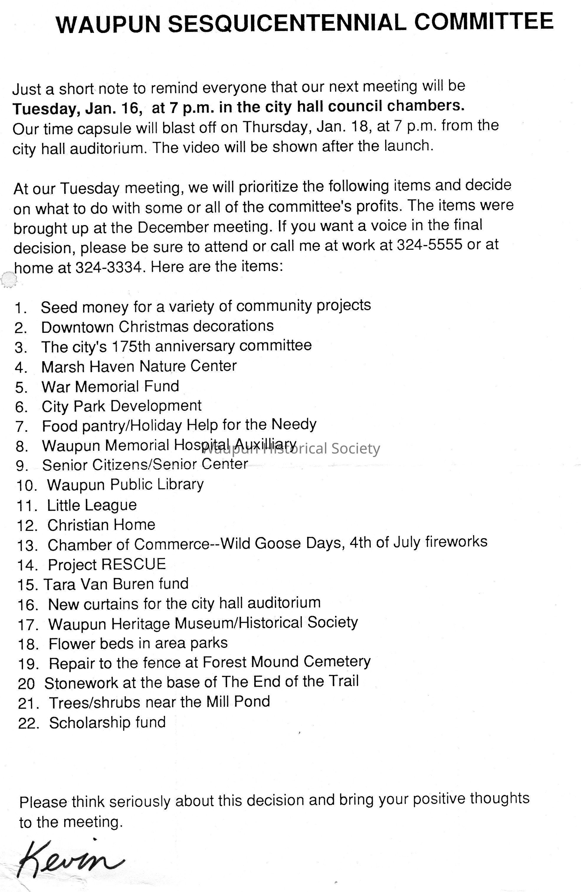 TO: WAUPUN SESQUICENTENNIAL COMMITTEE