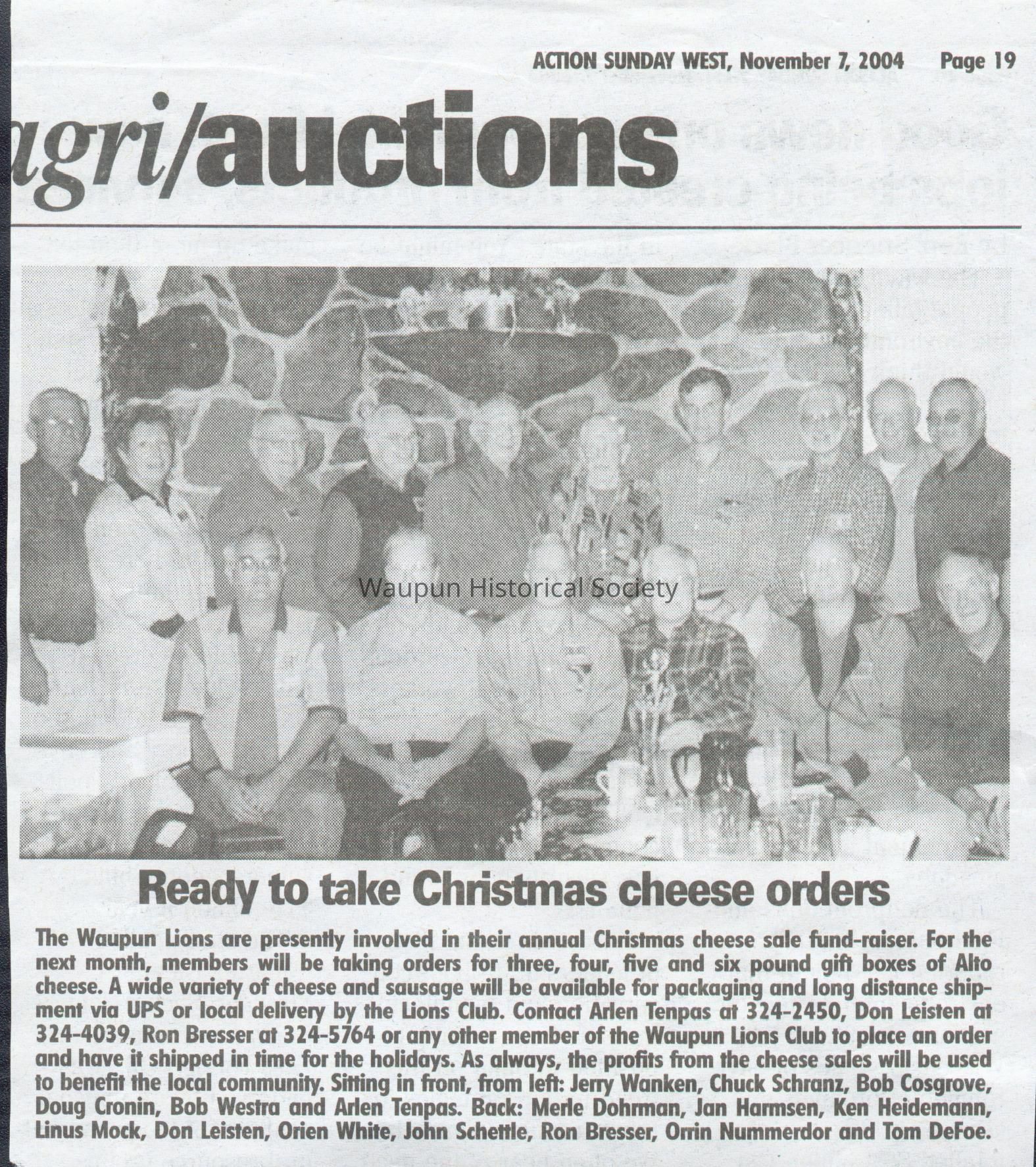 Lions Club photo. Apparently taken 10/26/2004. The photo appeared in the Action Sunday West of November 7, 2004. We have both the newspaper article and a copy of the actual photo. Caption under photo indicates: Ready to take Christmas cheese orders.
