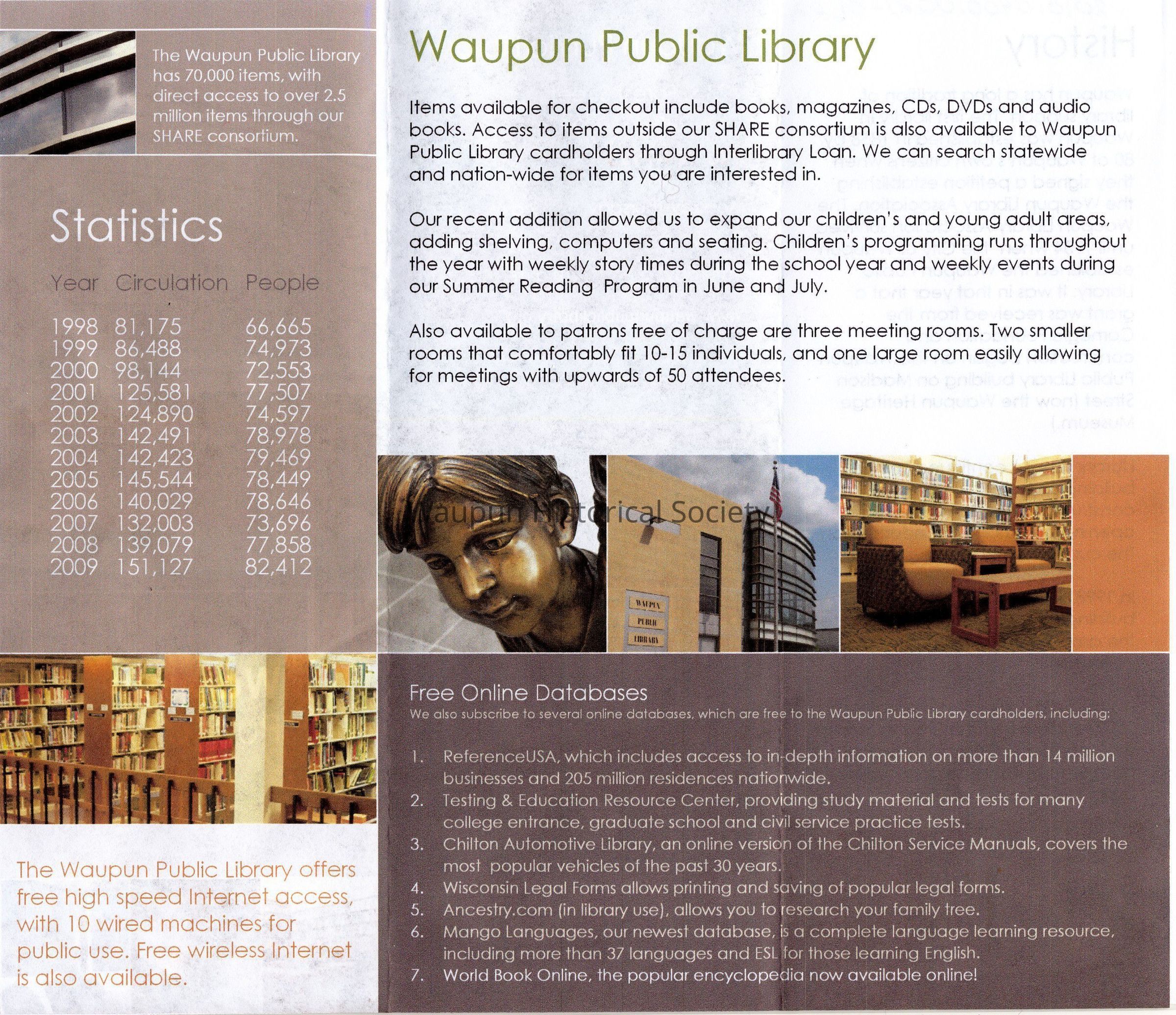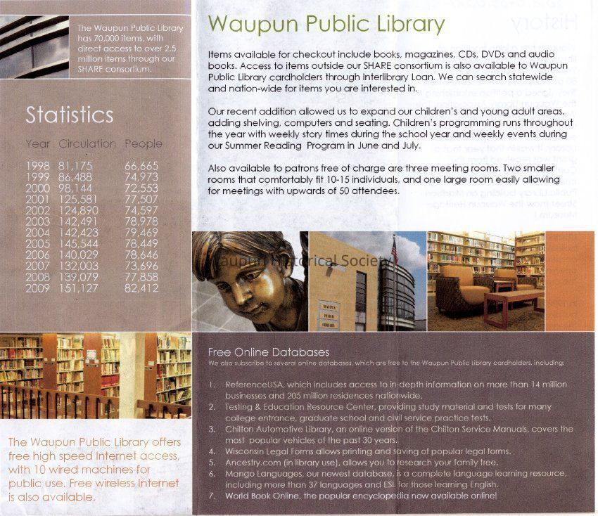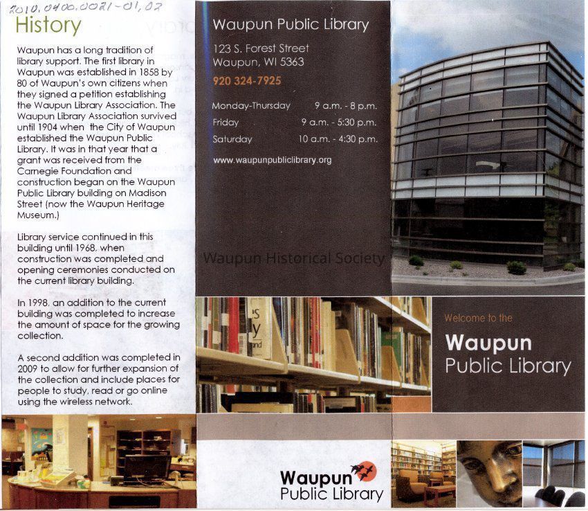 Handout from Waupun Public Library. These were given out when the new addition added in 2010 was completed.
