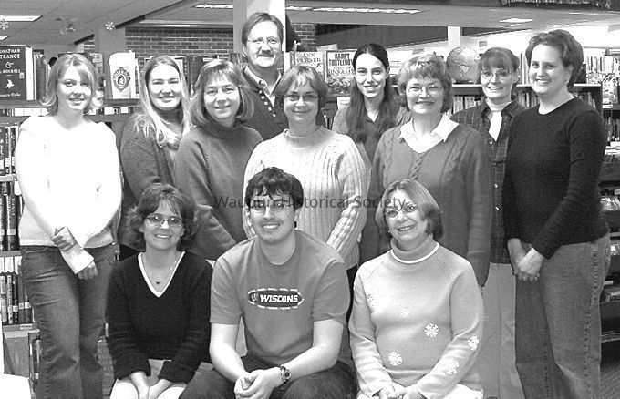Public Library Employees. This photo was emailed by the Monday Marketeer. It appeared in their "Faces & Places" of Feburary 2005. Caption under the photo indicates: Waupun Public Library employs the following to assist you in a visit to the library: Front row from left: Tami Lont, Peter Bruins and Kathy Jensen; back row, Christine Scheuers, Pam Garcia, Donna Maxwell, Bret Jaeger, Kay Hansen, Laura Leu, Susan Kuzulka, Tina Pawicz and Doreen Lont. Not pictured is Cody DeHaan and Bethany Jansma.