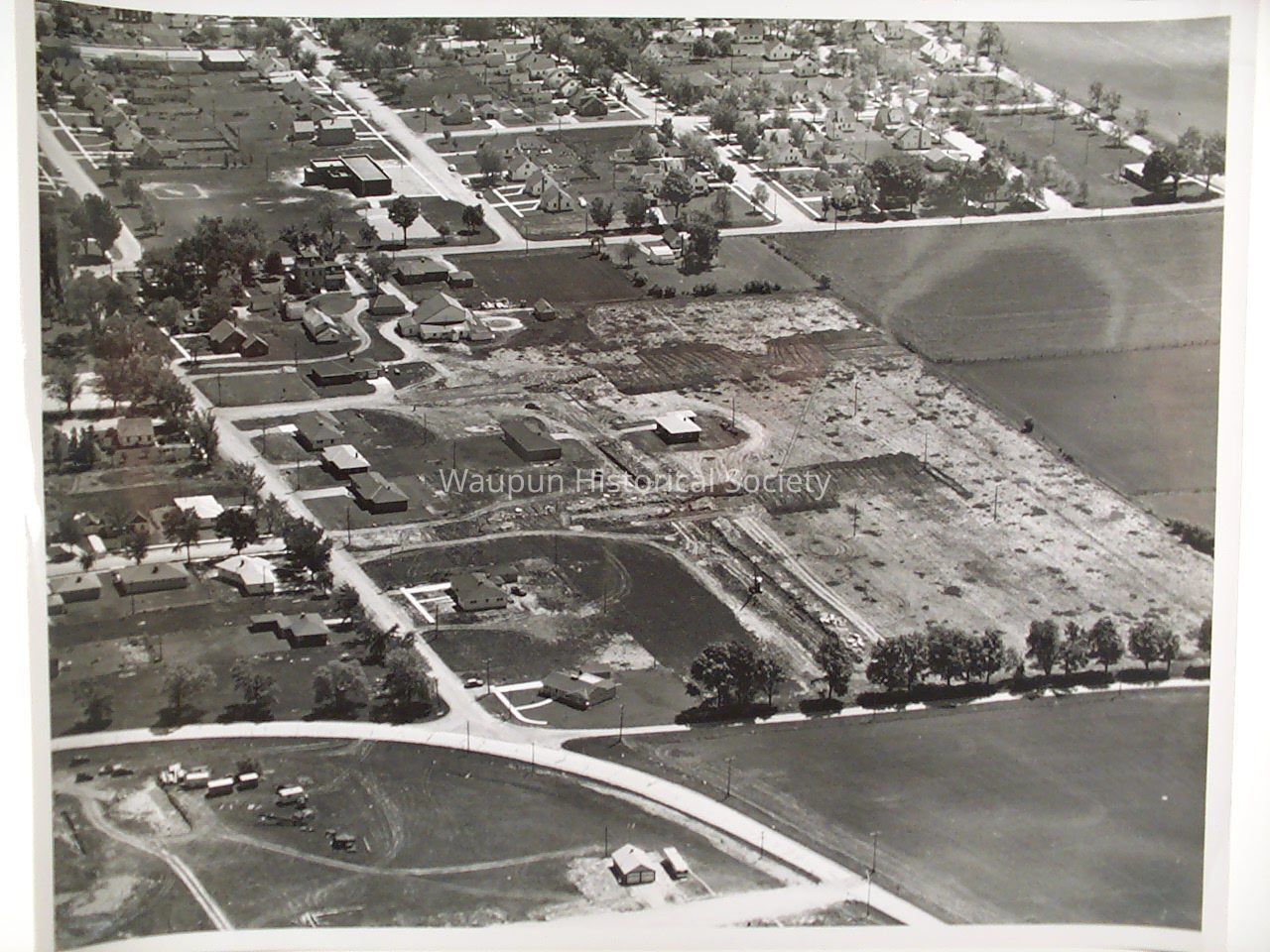 Waupun 1950's aerial photos. Given by John Kirkpatrick who was the editor of the Waupun Leader News, for many years. Caption on the back indicates Waupun Lane, Waupun Road, Grace Street, and Fox Lake Road. Shows Christian Grade School, Dahl residence, East Central Breeders. This photo is also in 8 X 10 size at 2005.0003.0026.Acquisition