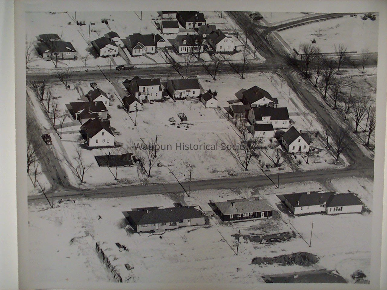 Waupun 1950's aerial photos. Given by John Kirkpatrick who was the editor of the Waupun Leader News, for many years. Caption on the back indicates Brown, Grace, Elm, and Johnson Streets. A cropped version of this photo is also available in 5 x 7 format at 2005.0003.0035.Acquisition