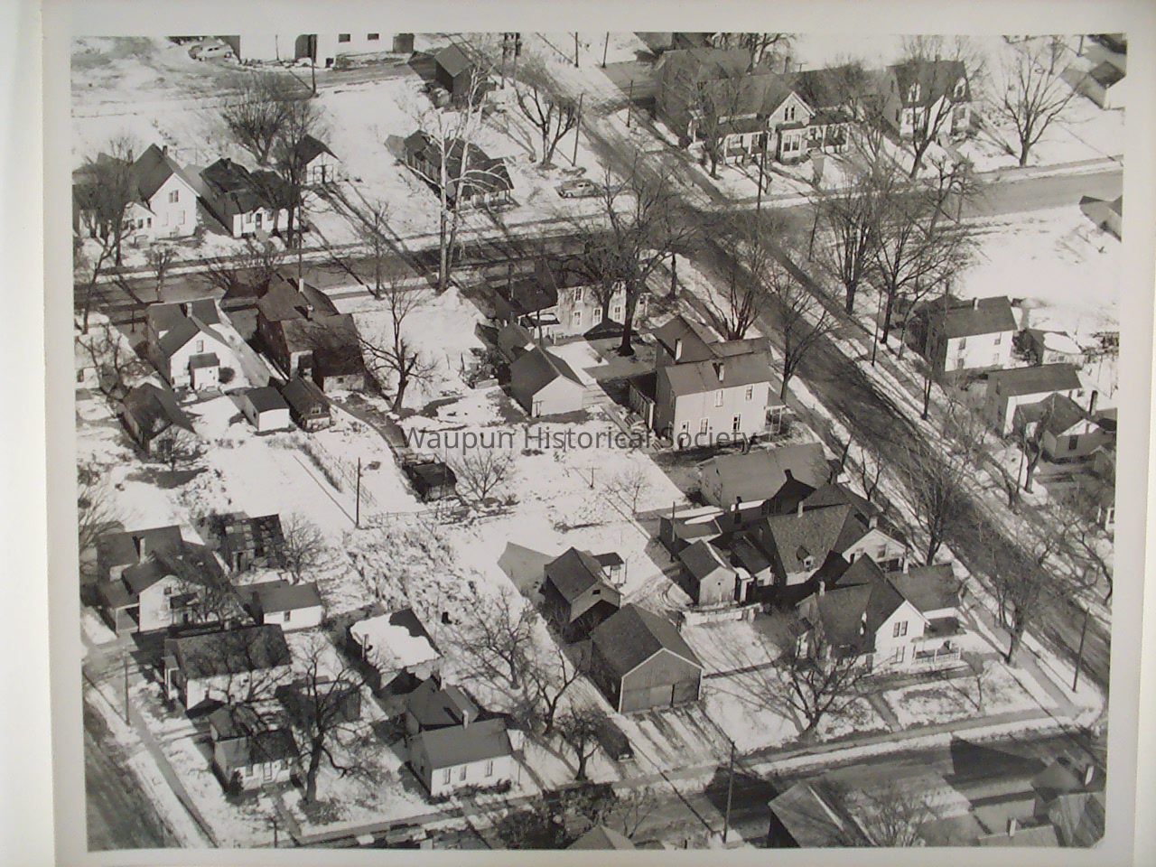 Waupun 1950's aerial photos. Given by John Kirkpatrick who was the editor of the Waupun Leader News, for many years. Caption on the back indicates Monroe Street, North Mill Street and Jackson Street. Also showing the Harris Home and edge of Mill / Canning Factory / Foundry. A cropped version of this photo is also available in 5 x 7 format at 2005.0003.0034.Acquisition