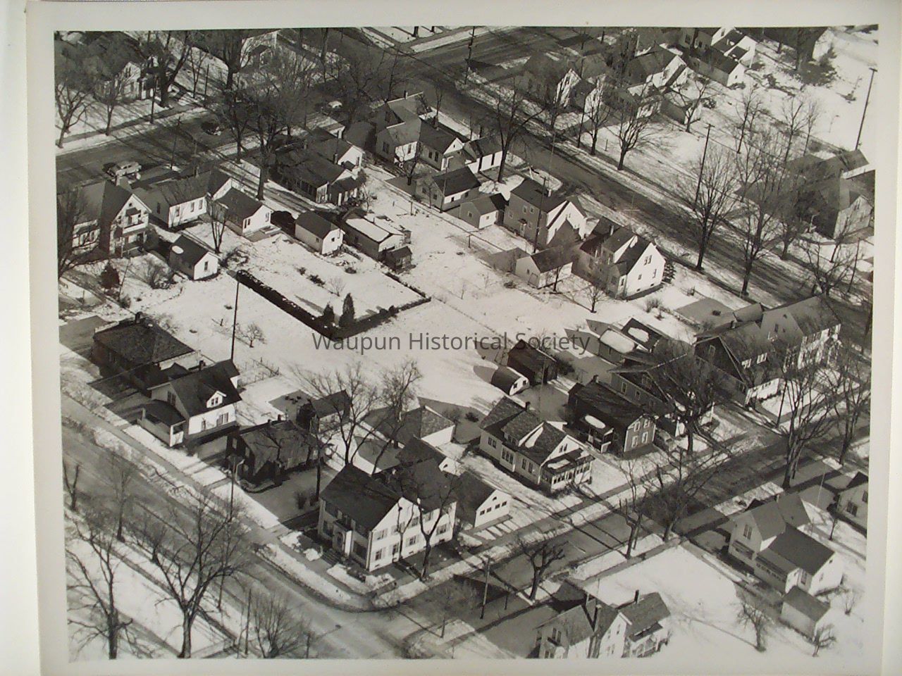 Waupun 1950's aerial photos. Given by John Kirkpatrick who was the editor of the Waupun Leader News, for many years. Caption on the back indicates South Grove Street, East Main Street, South Watertown Street, and East Jefferson Street. Also showing Meagher apartments.Acquisition