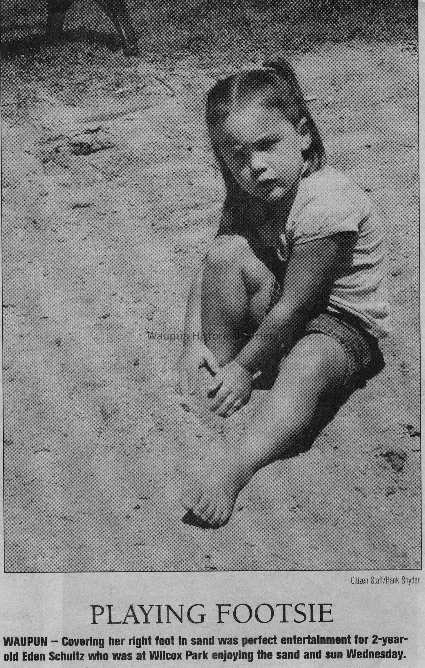 WAUPUN — Covering her right foot in sand was perfect entertainment for 2-year old Eden Schultz who was at Wilcox Park enjoying the sand and sun Wednesday.