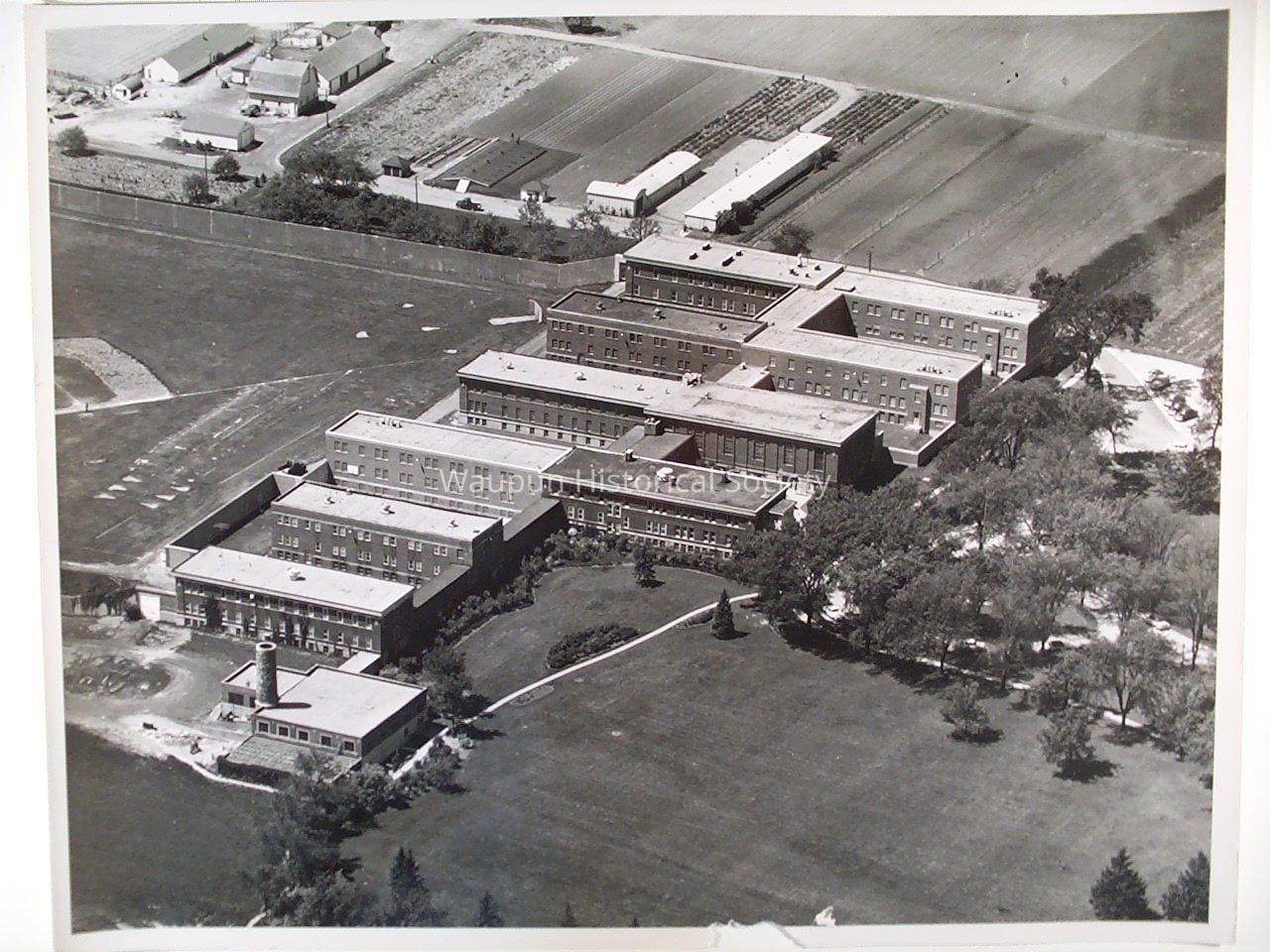 Waupun 1950's aerial photos. Given by John Kirkpatrick who was the editor of the Waupun Leader News, for many years. Caption on the back indicates Central State Hospital was for the criminally insane, and later became the Dodge Correctional Institution. This photo is also shown in 8 X 10 format at 2005.000.0027.Acquisition