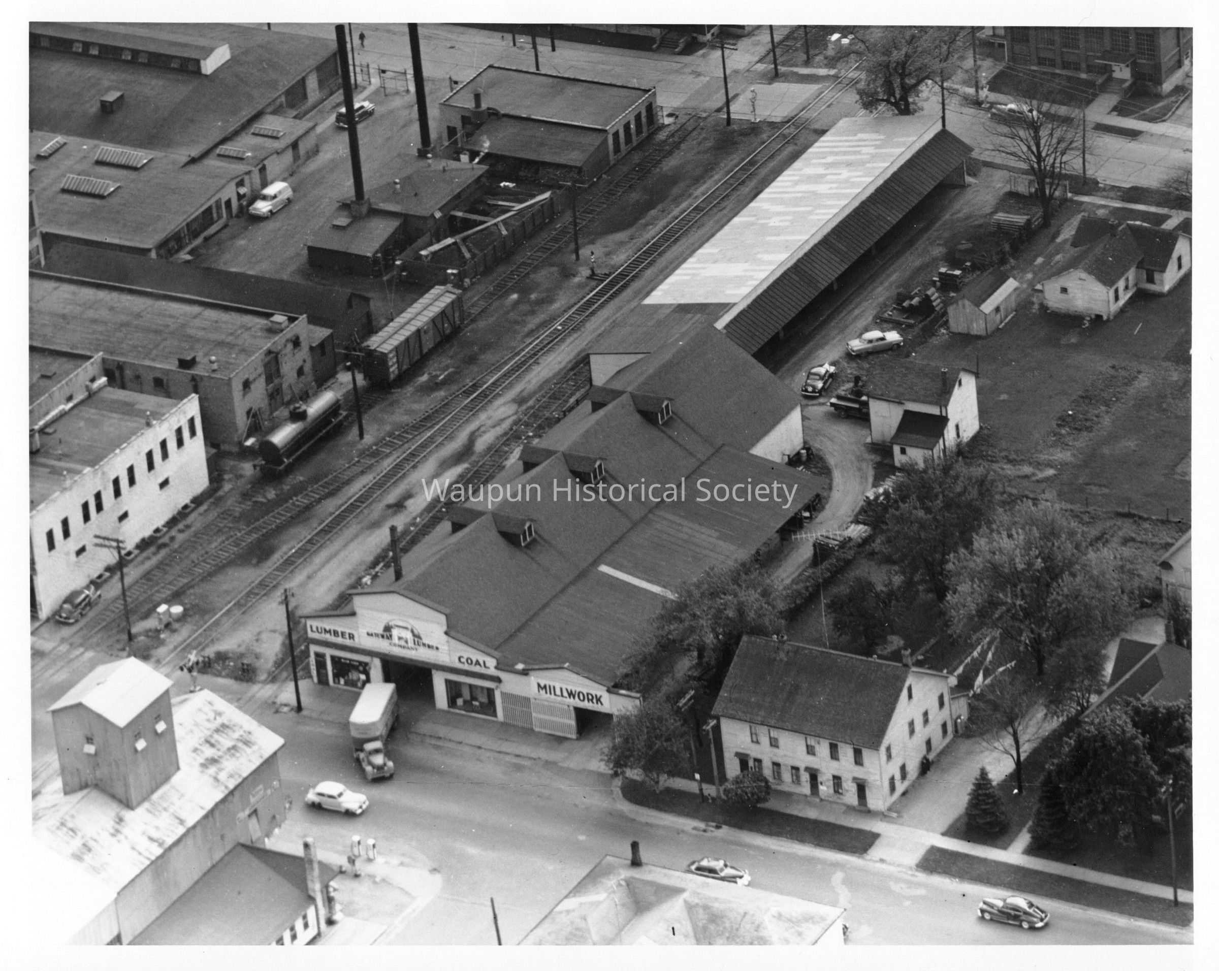 Waupun 1950's aerial photos. Given by John Kirkpatrick who was the editor of the Waupun Leader News, for many years. Caption on the back indicates main street, commercial street, and Jefferson street. Also showing Shaler National Rivet, rail road tracks, Gateway Lumber Company, Ohio House Hotel (Proprietor was Joshua Crawford, Great -Grandfather of Warren Harding), and a grain mill.Acquisition