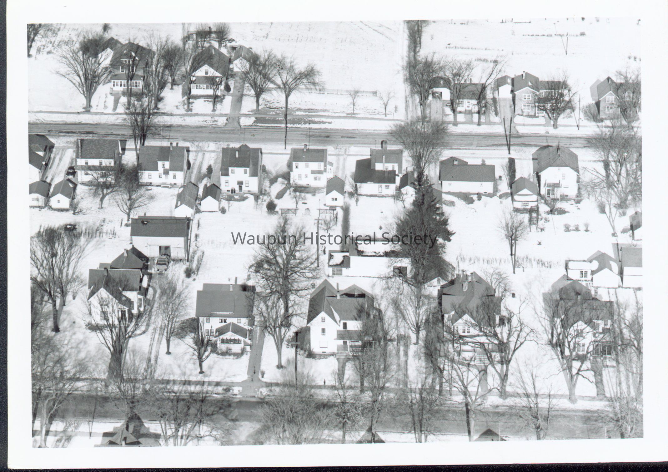 Waupun 1950's aerial photos. Given by John Kirkpatrick who was the editor of the Waupun Leader News, for many years. Caption on the back indicates West Franklin Street, West Main Street. This photo is also in 11 x 14 format at 2005.0003.0019.Acquisition