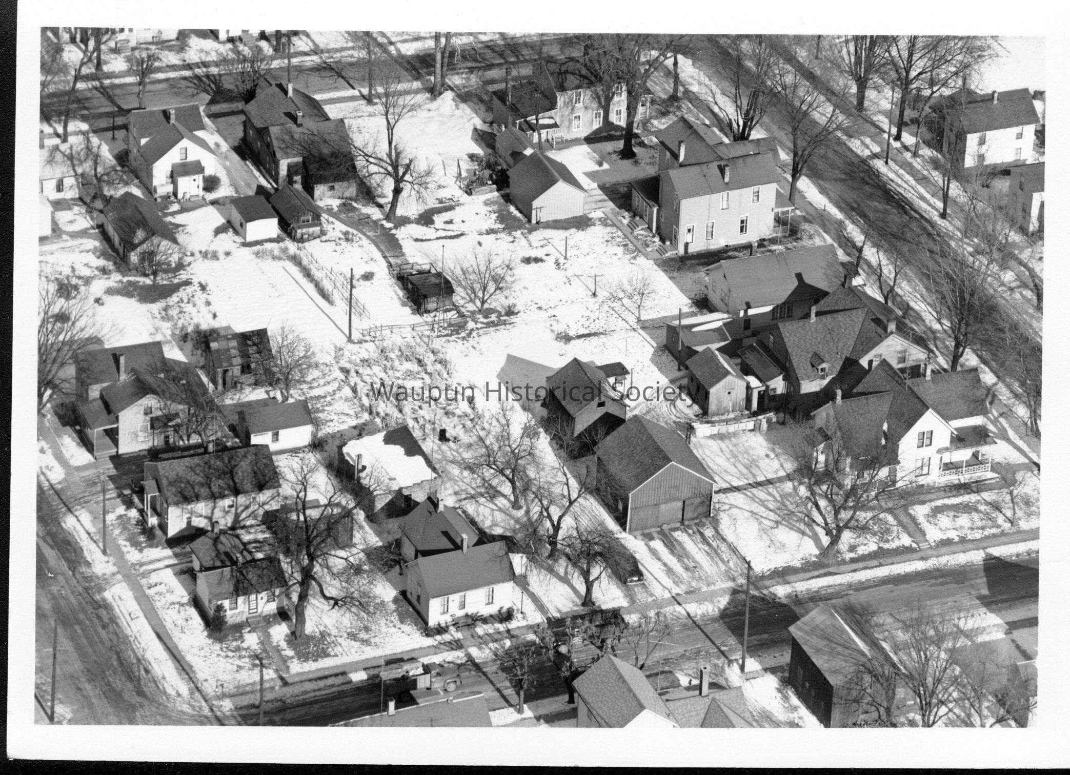 Waupun 1950's aerial photos. Given by John Kirkpatrick who was the editor of the Waupun Leader News, for many years. Caption on the back indicates Monroe Street, North Mill Street and Jackson Street. Also showing the Harris Home and edge of Mill / Canning Factory / Foundry. A n un cropped version of this photo is also available in 11 x 14 format at 2005.0003.0010.Acquisition