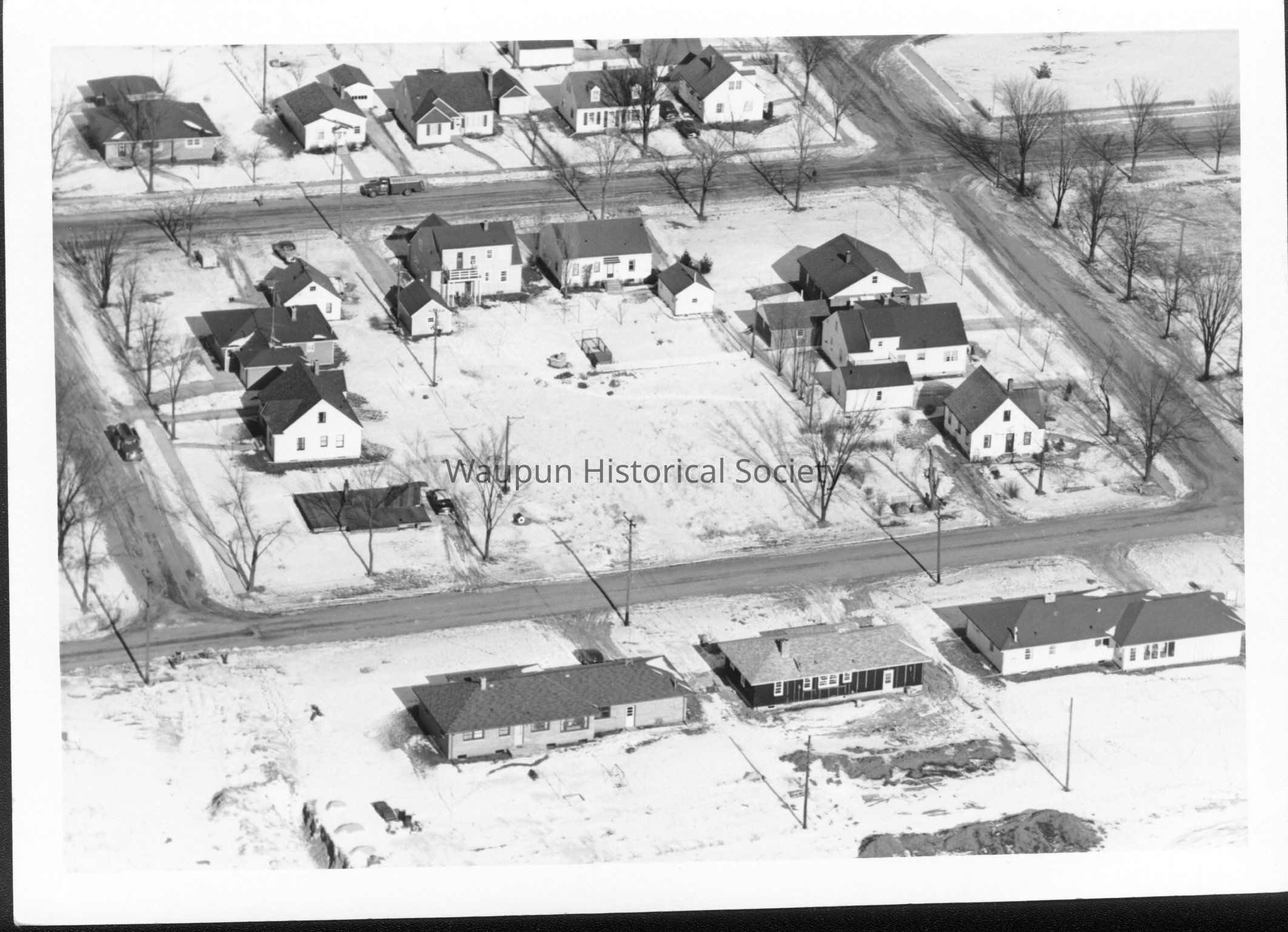 Waupun 1950's aerial photos. Given by John Kirkpatrick who was the editor of the Waupun Leader News, for many years. Caption on the back indicates Brown, Grace, Elm, and Johnson Streets. A cropped version of this photo is also available in 11 x 14 format at 2005.0003.0009.Acquisition