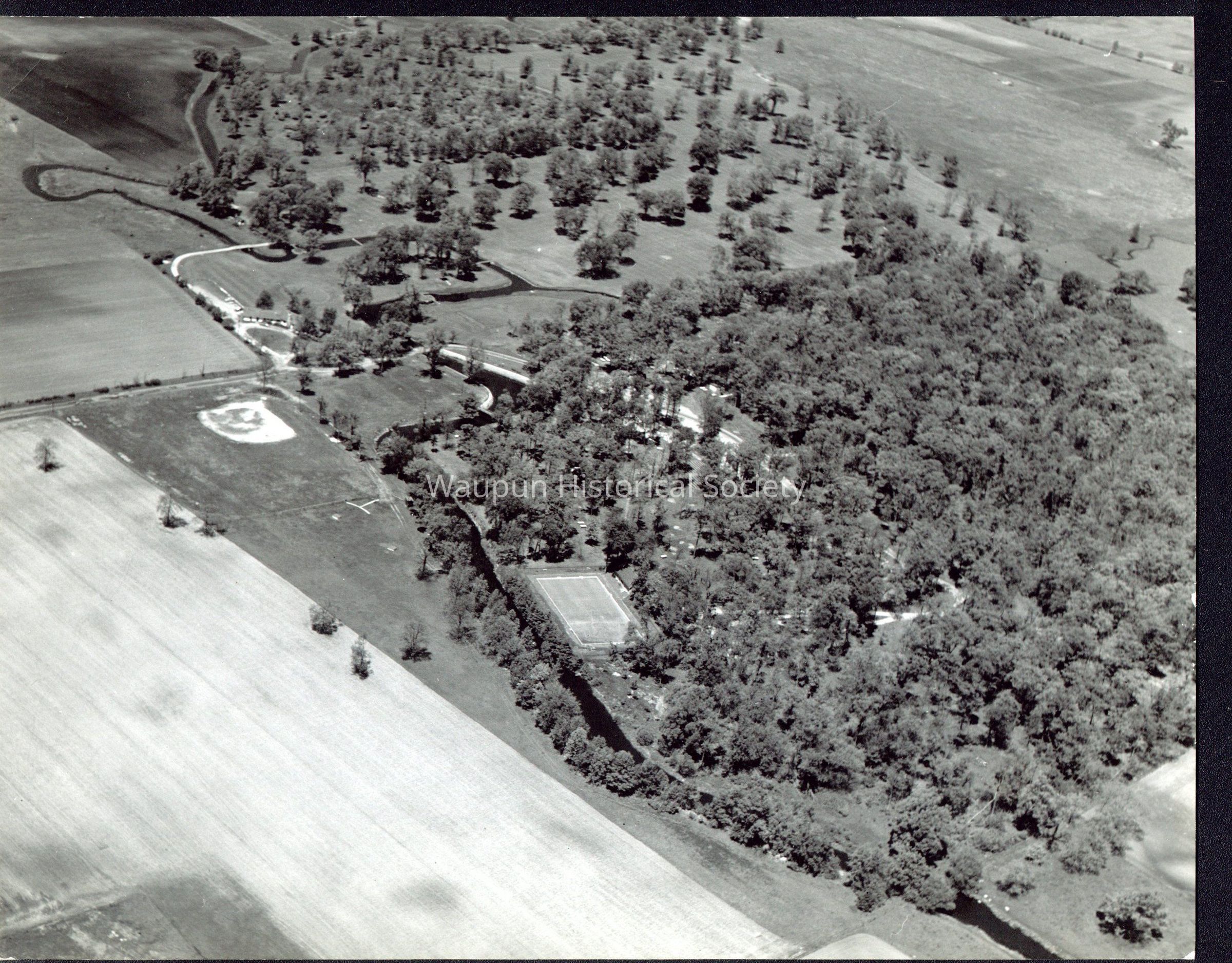 Photograph, Parks, Fond du Lac County Park, Aerial, 1950s. Waupun 1950's aerial photos. Given by John Kirkpatrick who was the editor of the Waupun Leader News, for many years. Caption on the back indicates County Park Road or County Highway MMM. Also showing Rock River Country Club, Fond du Lac County Park, and Rock River. This picture is also available in 11 x 14 format 2005.0003.0012.Acquisition