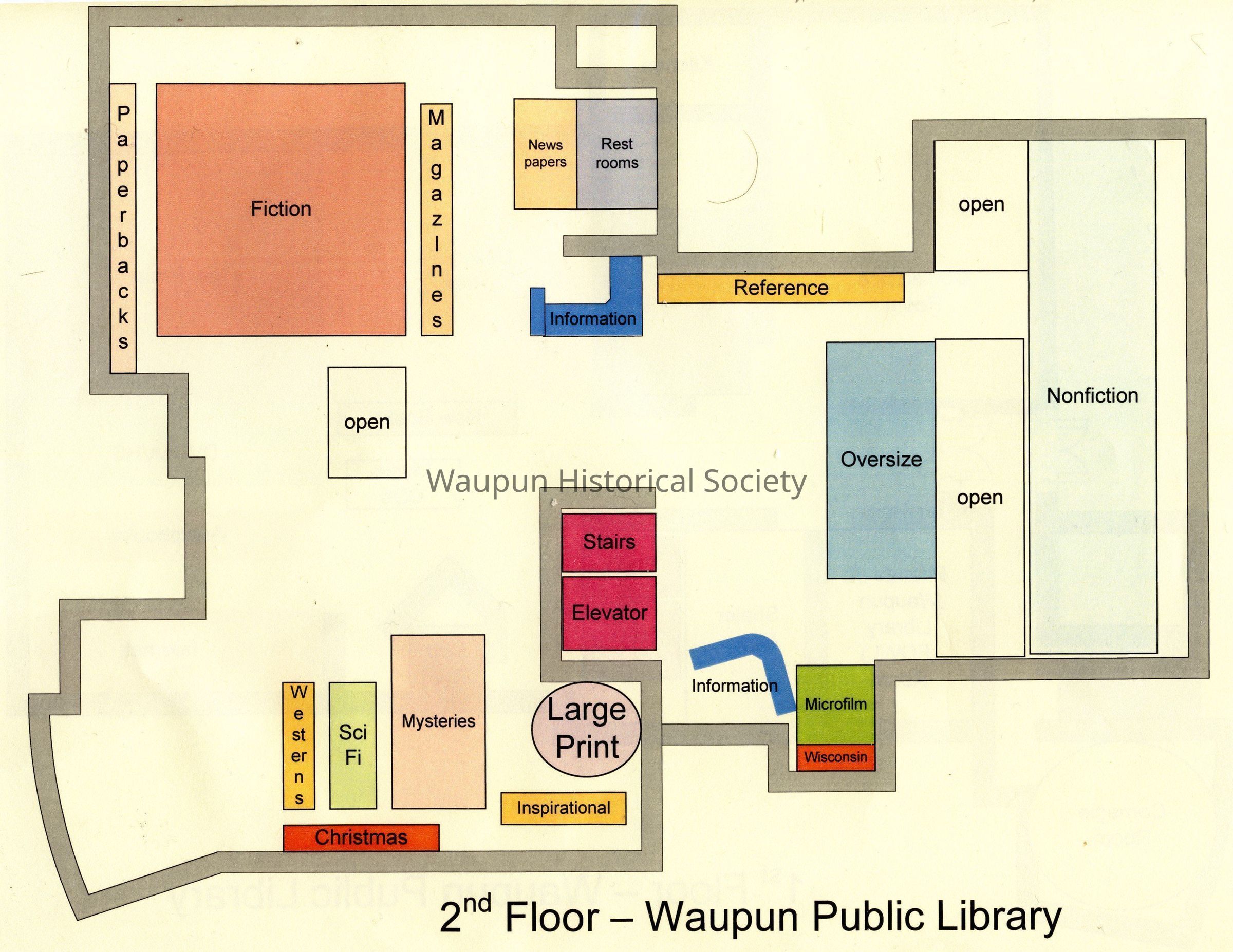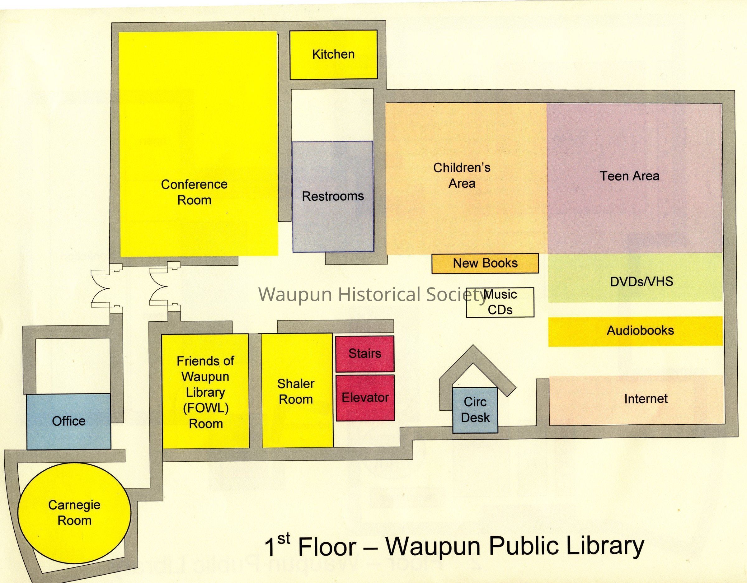 Floor Plan, Library. Floor plan for the Waupun Library. These were handed out in 2010 with the completion of the new addition to the building. This was after the completion of the second addition to the library.Acquisition