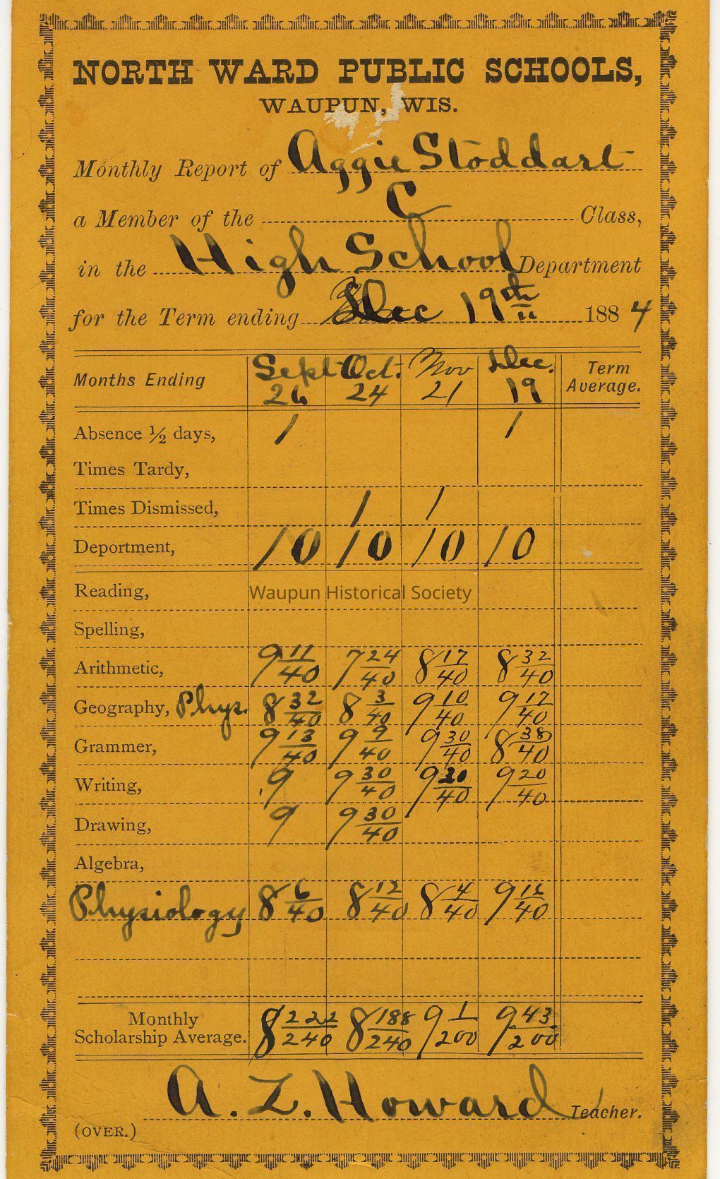 North Ward Public School Report Card. This is the Dec. 19th, 1884 Report card for Aggie Stoddart. Her teacher was A.Z Howard. Signed on the reverse side by Tho. R. Stoddart.Acquisition