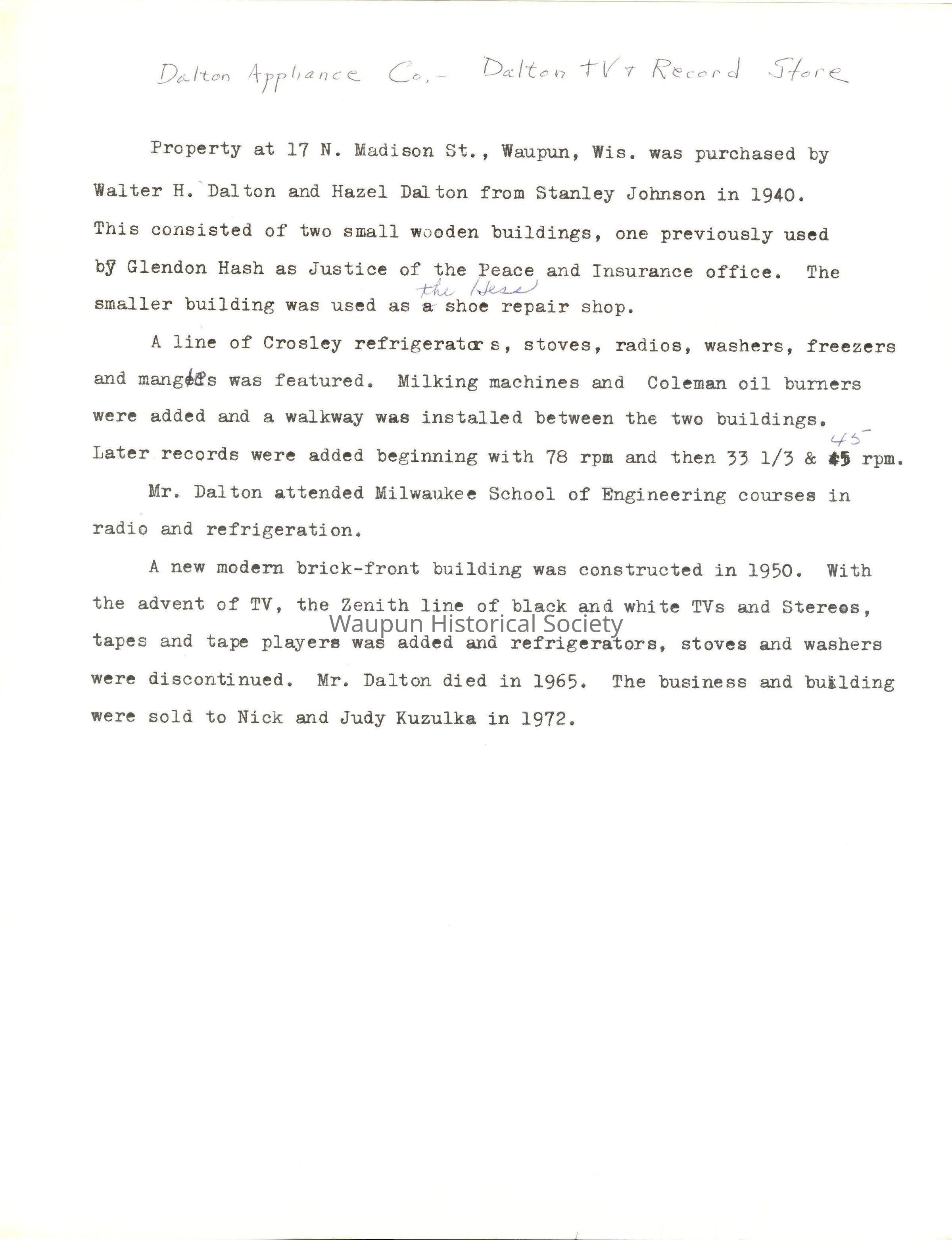 Historical information on Dalton Appliance Co. - Dalton TV & Record Store for 1976 Bicentennial Celebration in Waupun, WI