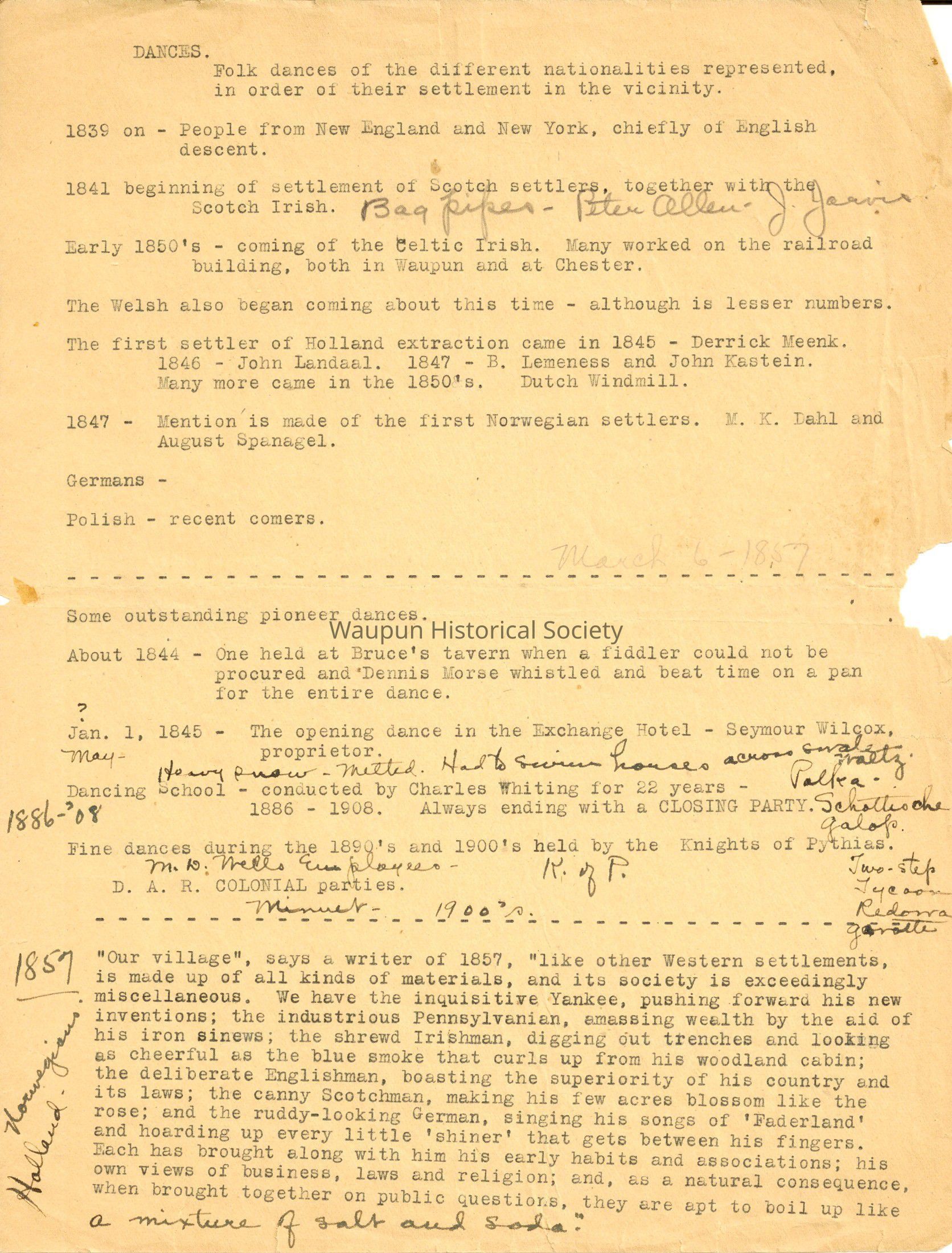 Dances/folk dances of the people that settled in Waupun, arranged in the order of their settlement to the area. A typed page on non-archival, discolored paper with some additional handwritten notes in the margins.