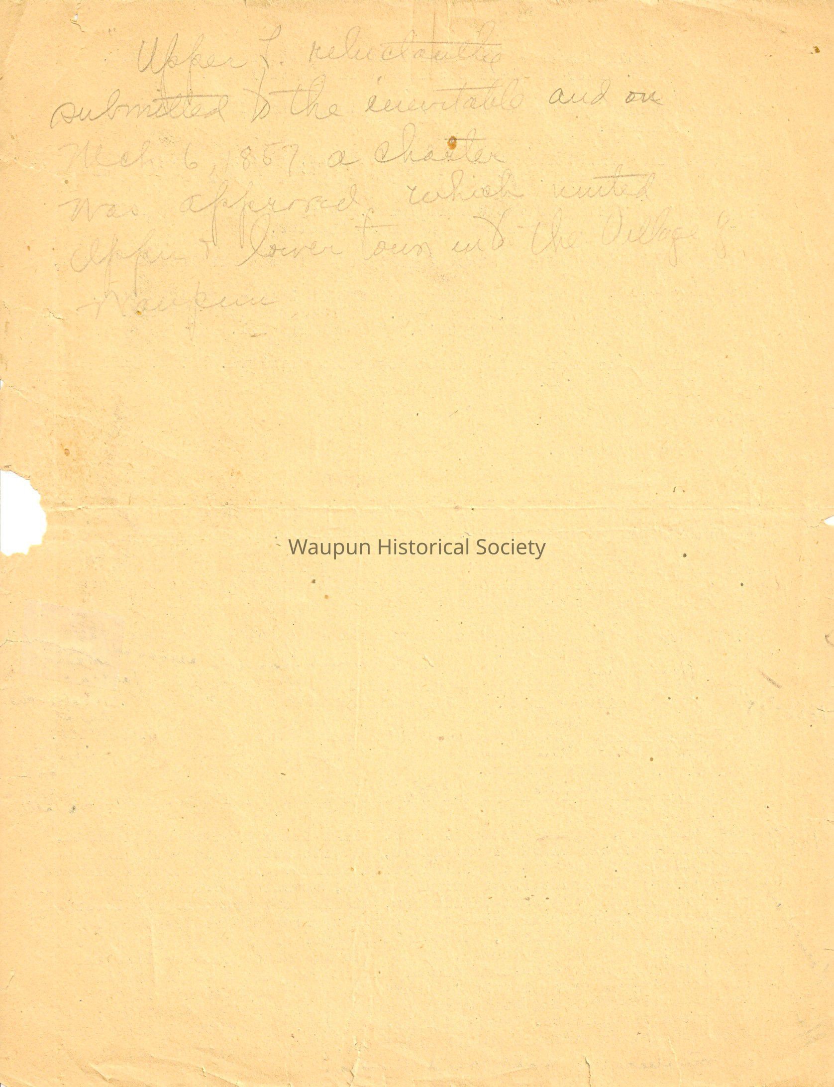 Upper T (Town ?) reluctantly submitted to the inevitable and on March 6, 1857 a charter was approved which united Upper and Lower town into the village of Waupun.Acquisition