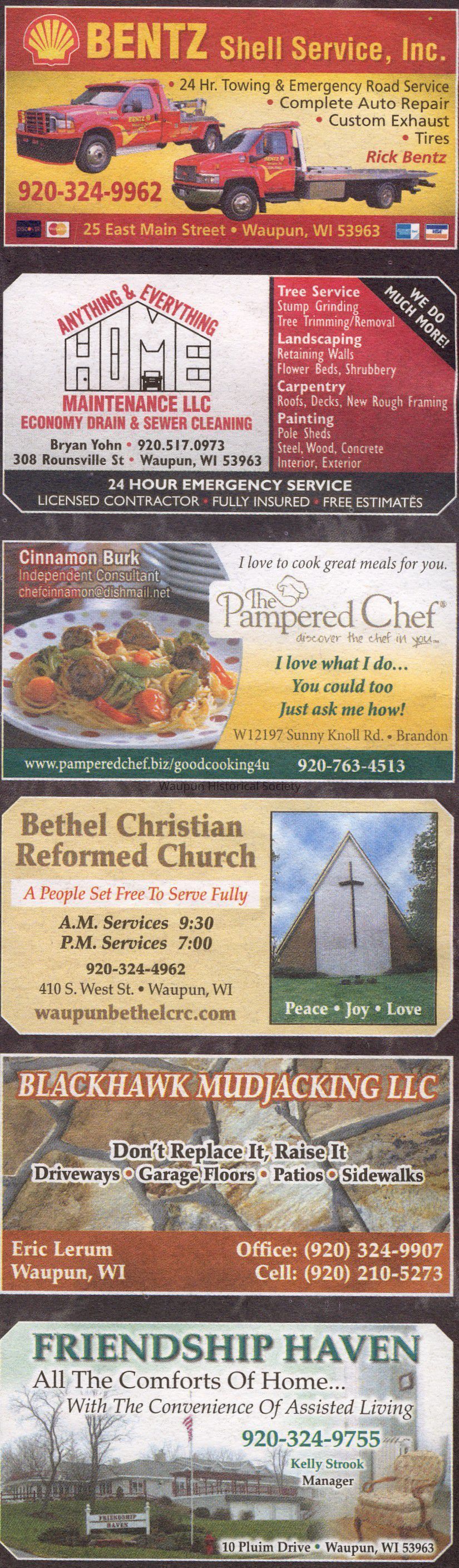 Central Well Digging, Community Psychological Services, Pete's Auto Repair, Jerry's Antenna Service, Masters of Movement School of Dance, Club Fitness, The National Bank of Waupun, TJ's Auto Body, Grant, Snow & Snow, S.C. Attorneys At Law,Shaw's Cut and Dried Lumber, Neumark Stensberg Design & Print Inc., Hoekstra's Custom Operations, Re-Bath, Flyway Mutual Insurance Co., Bentz Shell Service, Home Maintenance LLC., The Pampered Chef, Bethel Christian Reformed Church, Blackhawk Mudjacking LLC. and Friendship HavenAcquisition