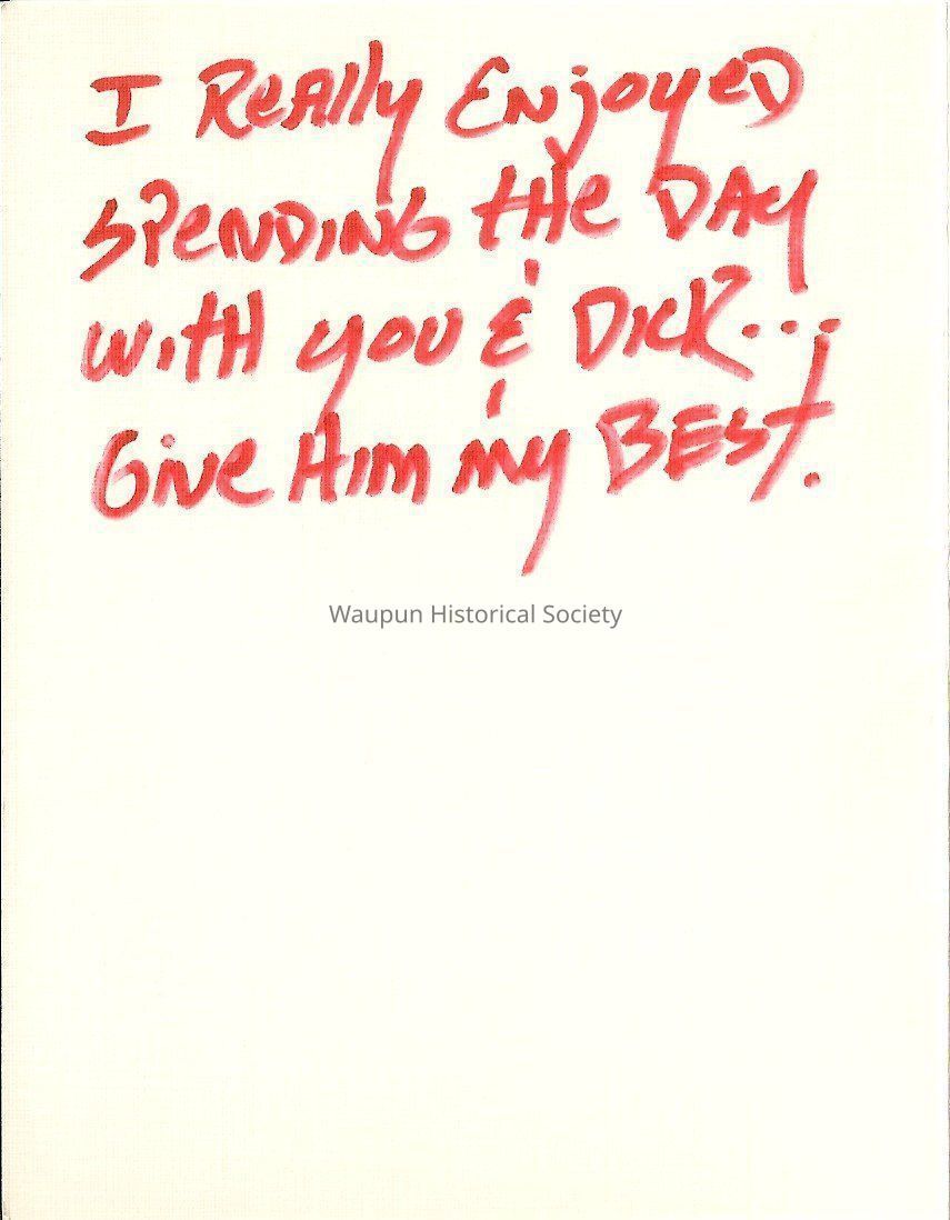 I really enjoyed spending the day with you and Dick ... Give Him my best. The Dick refered to here is Dick (Richard) Peters, Fox Lake, WI. They preformed magic together while in High School.