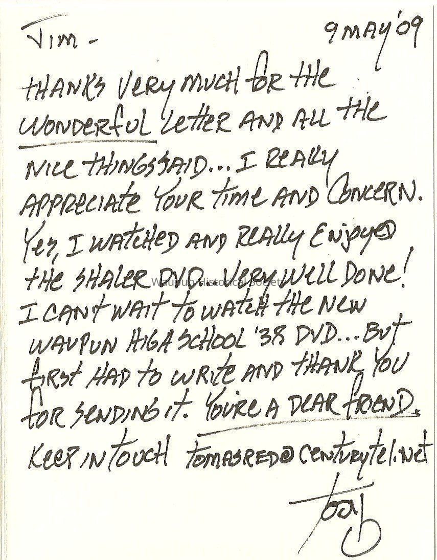 Thanks very much for the wonderful lett and all the nice things said .. I really appreciate your time and concern. Yes, I watched and really enjoyed the Shaler DVD .. Very well done! I can't wait to watch the new Waupun High School '38 DVD ... But first had to write and thank you for sending it. You're a dear friend. Keep in touch tomasred@centurytel.net