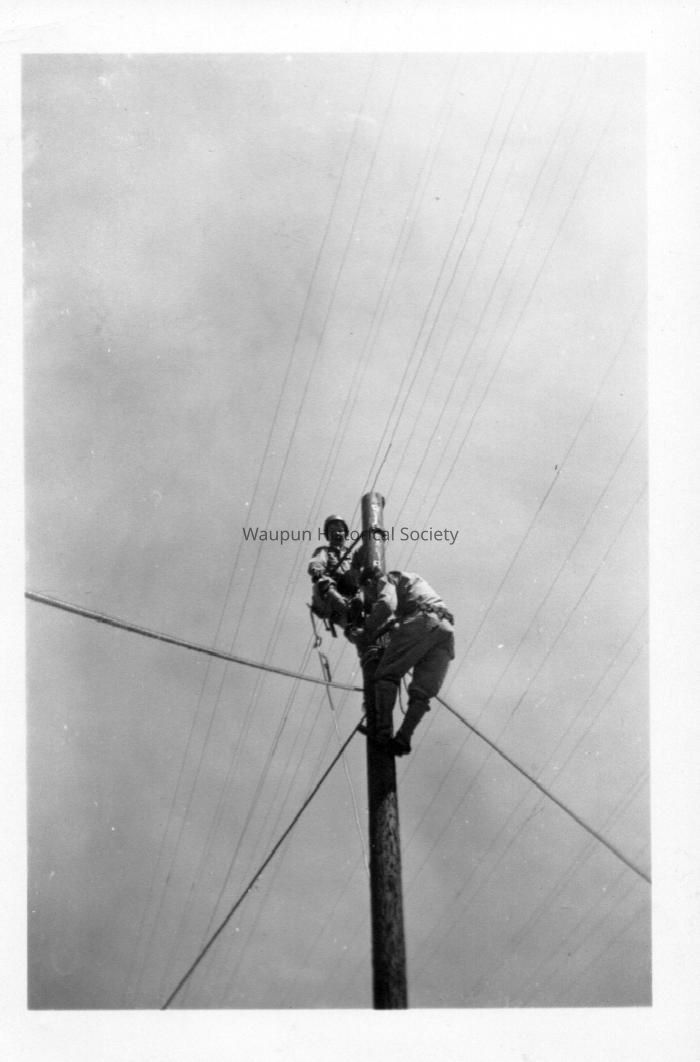 Mr. Walter Riel was a Sergeant with the 38th Photo Reconnaissance Squadron, 13th Air Force from 1942-1946. The Riel Collection is a series of photos that were given to the Waupun Historical Society by Mr. Riel. This photo is taken during training at Camp Crowder, MO., for telephone & Teletype linemen.Acquisition