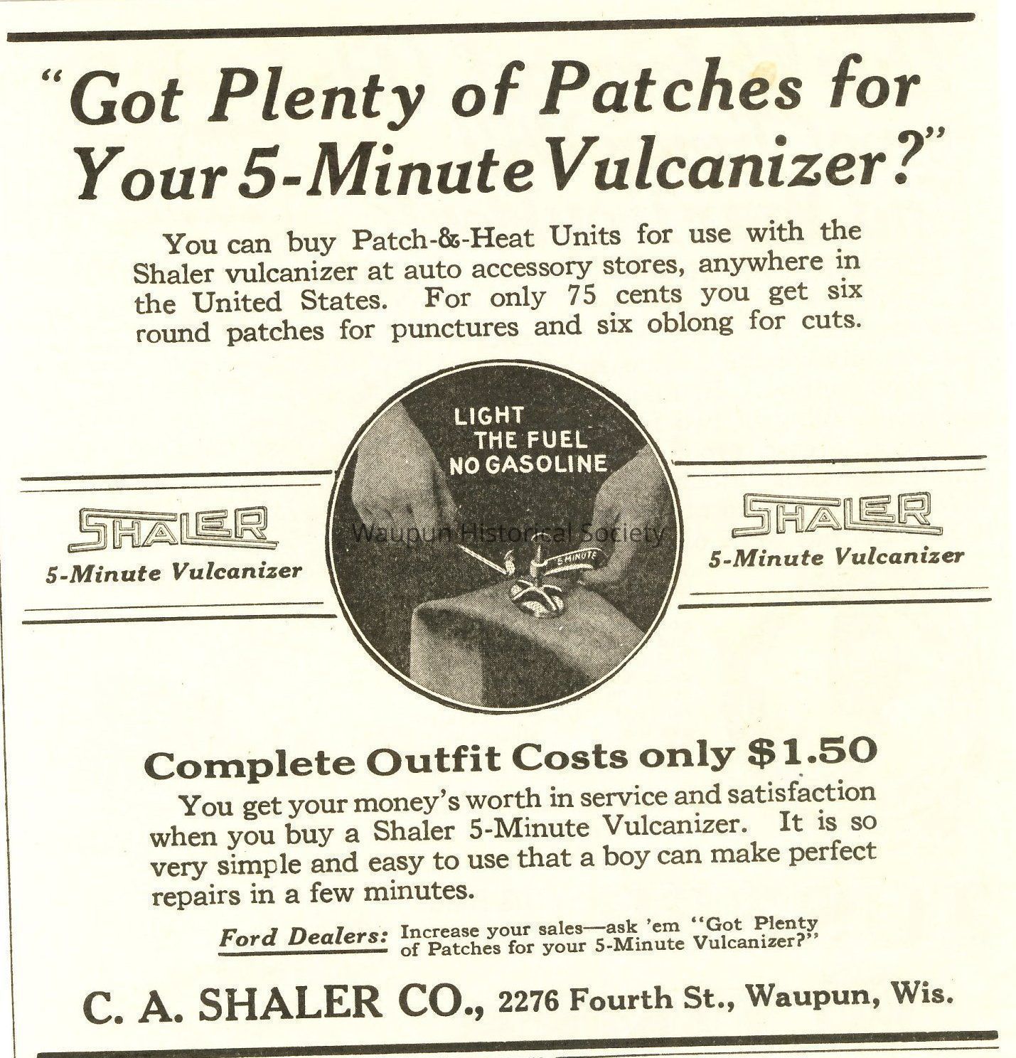 Shaler, advertisment for patches for the 5-Minute Vulcanizer. C.A. Shaler Co., 2276 Fourth St., Waupun, Wis.Acquisition