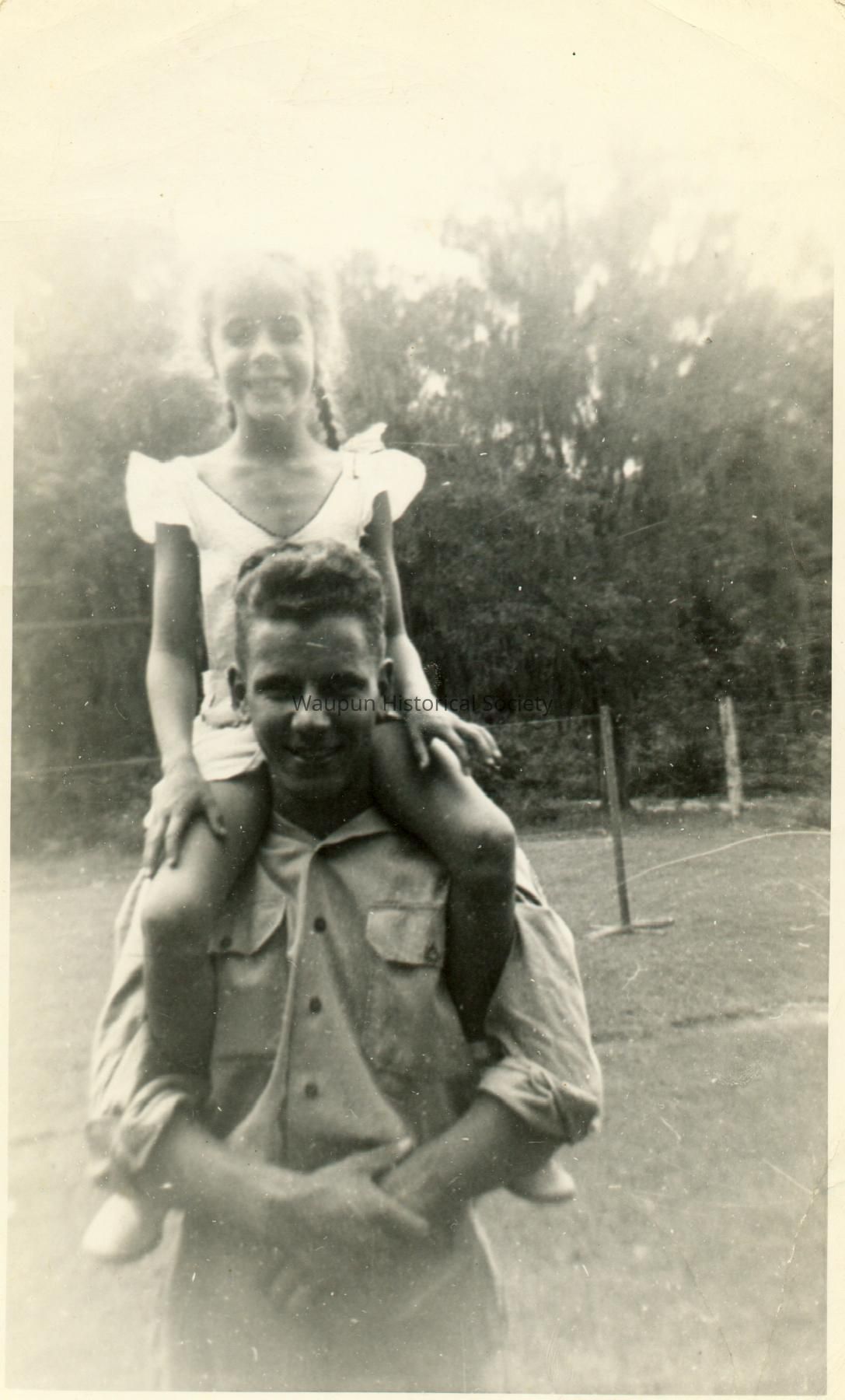 Mr. Walter Riel was a Sergeant with the 38th Photo Reconnaissance Squadron, 13th Air Force from 1942-1946. The Riel Collection is a series of photos that were given to the Waupun Historical Society by Mr. Riel. This photo shows Walter with one of the Moes girls.Acquisition