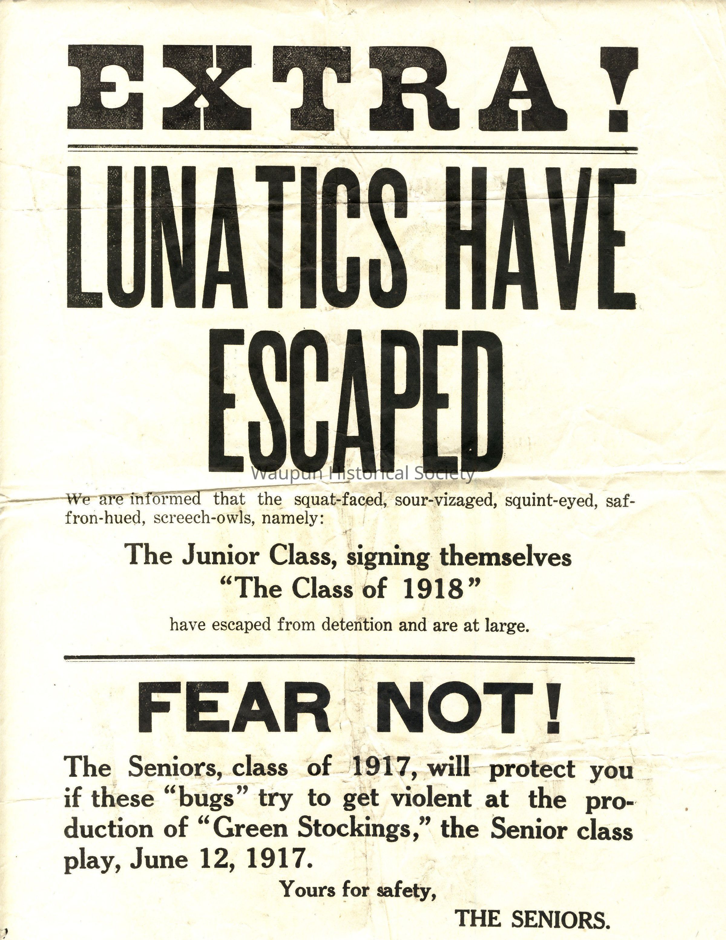 Lunatics Have Escaped. We are informed that the squat-faced, sour-vizaged, squint-eyed, saffron-hud, screech-owls, namely: The Junior Class, signing themselves "The Class of 1918" have escaped from detention and are at large.