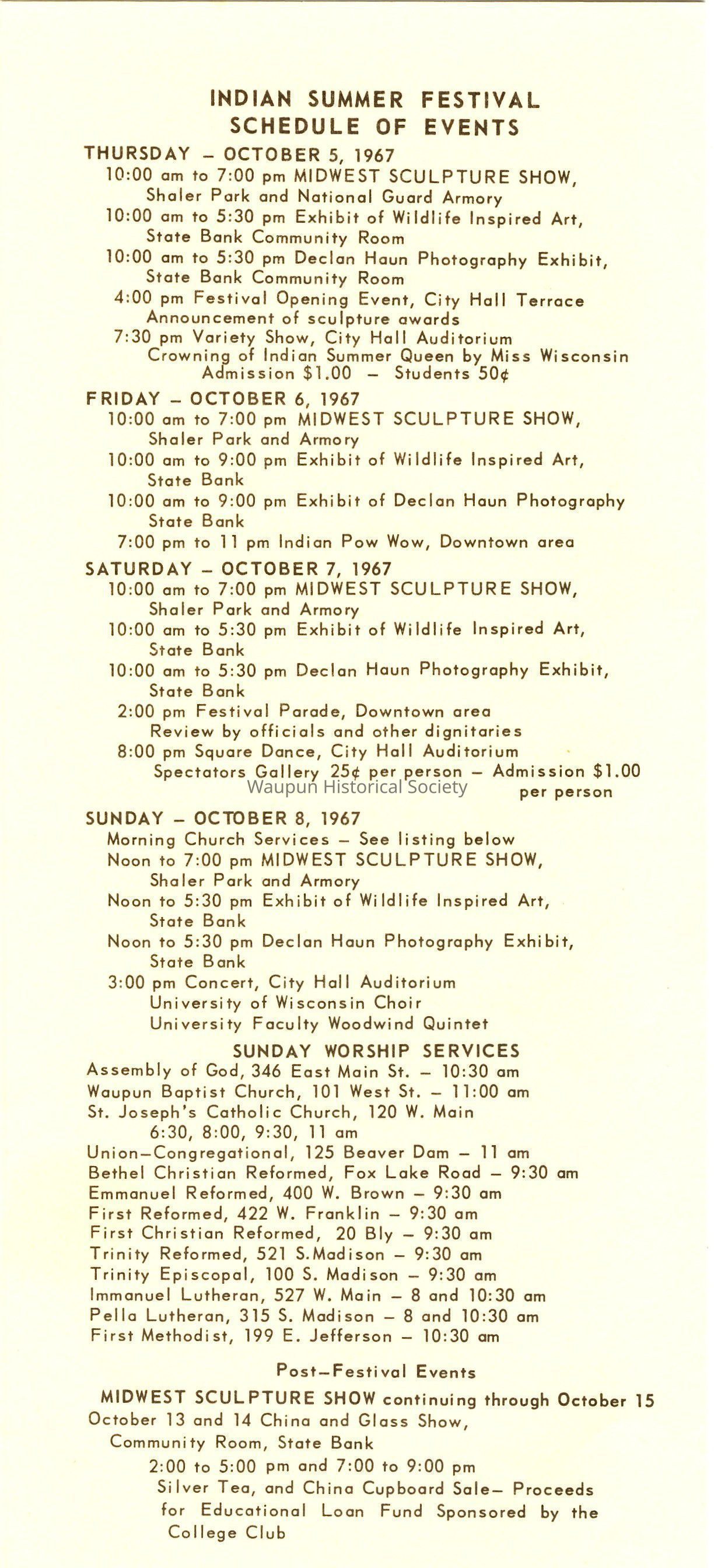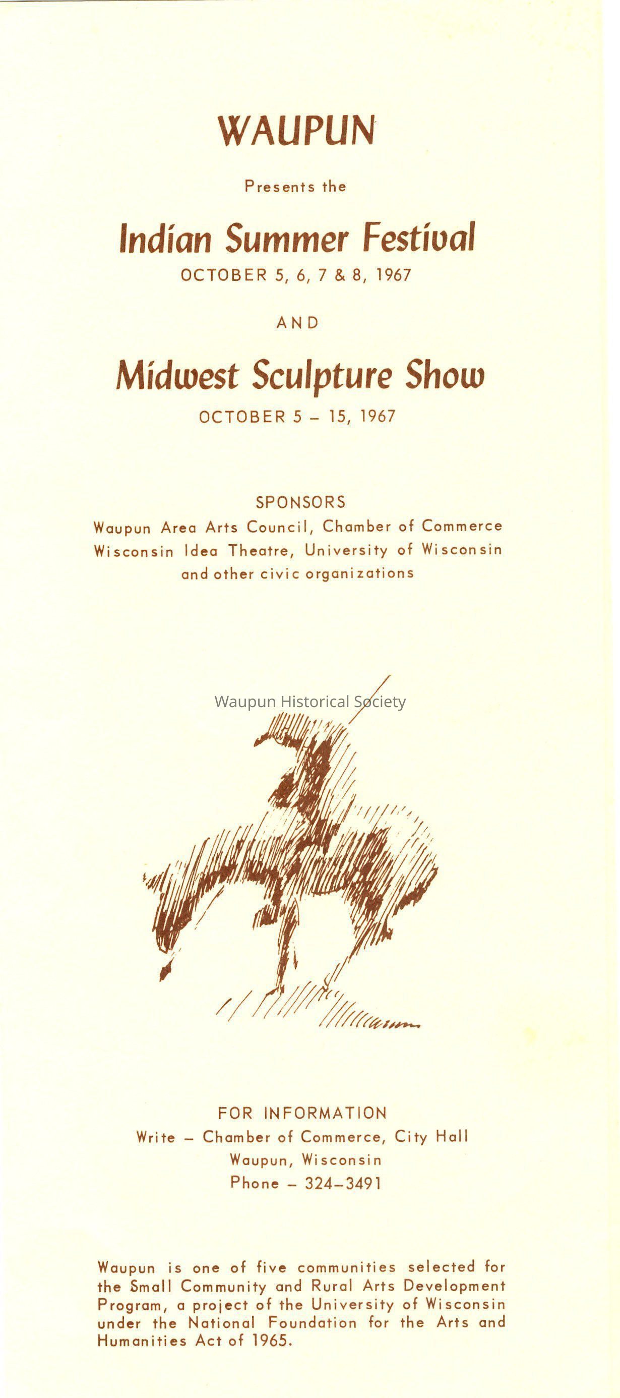 WAUPUN Presents the Indian Summer Festival, OCTOBER 5, 6, 7 & 8, 1967 AND Midwest Sculpture Show, OCTOBER 5 - 15, 1967.