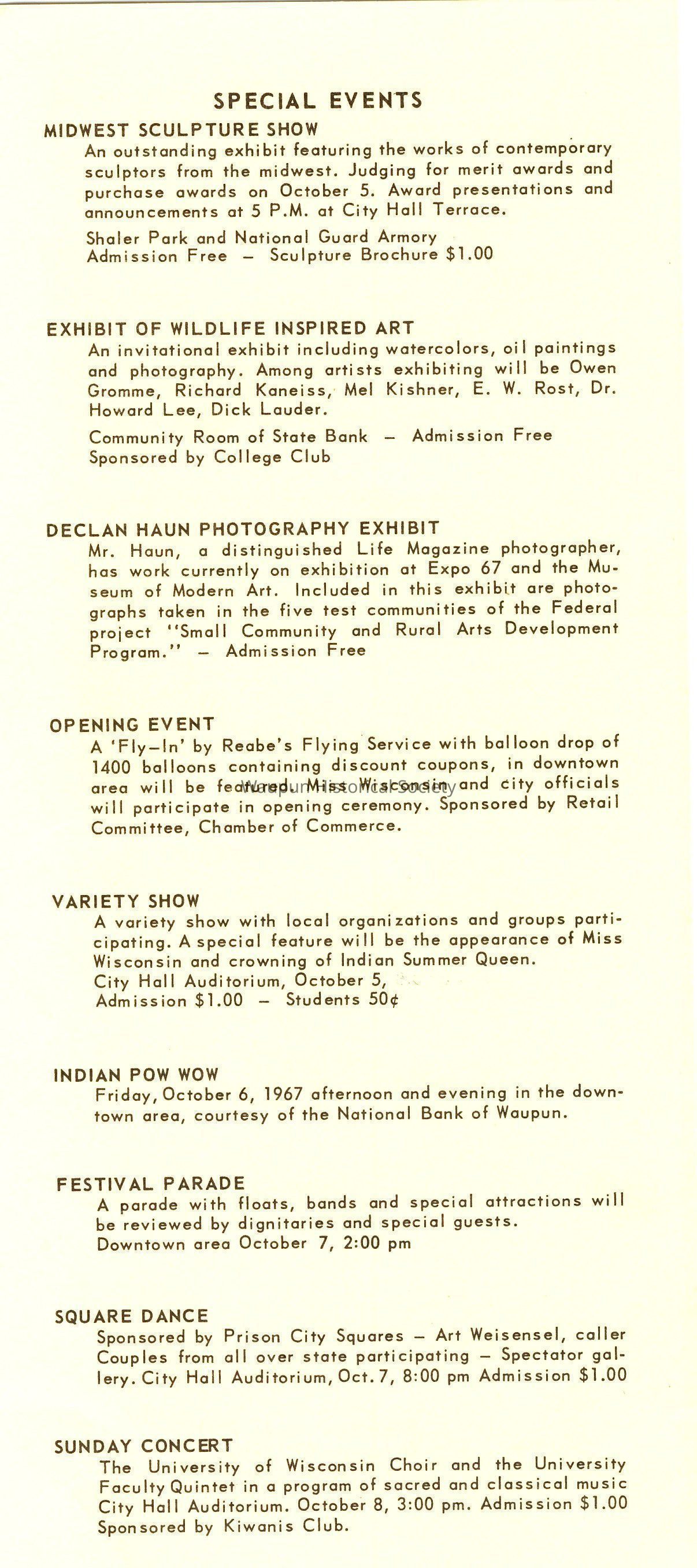 SPONSORS: Waupun Area Arts Council, Chamber of Commerce, Wisconsin Idea Theatre, University of Wisconsin and other civic organizations.