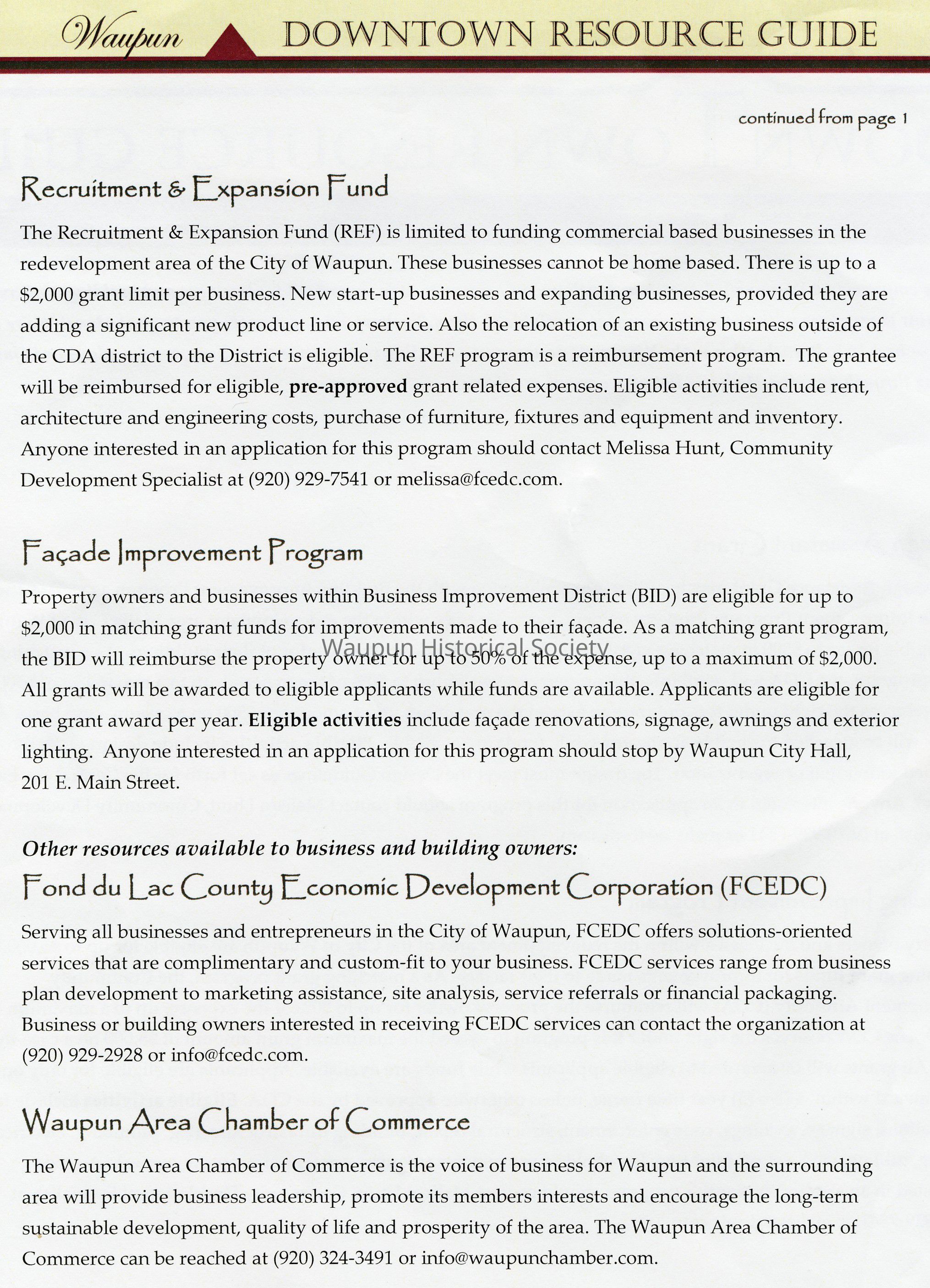 The Recruitment & Expansion Fund (REF) is limited to funding commercial based businesses in the redevelopment area of the City of Waupun. These businesses cannot be home based. There is up to a $2,000 grant limit per business. New start-up businesses and expanding businesses, provided they are adding a significant new product line or service. Also the relocation of an existing business outside of the CDA district to the District is eligible. The REF program is a reimbursement program. The grantee will be reimbursed for eligible, pre-approved grant related expenses. Eligible activities include rent, architecture and engineering costs, purchase of furniture, fixtures and equipment and inventory. Anyone interested in an application for this program should contact Melissa Hunt, Community Development Specialist at (920) 929-7541 or melissa@fcedc.com.