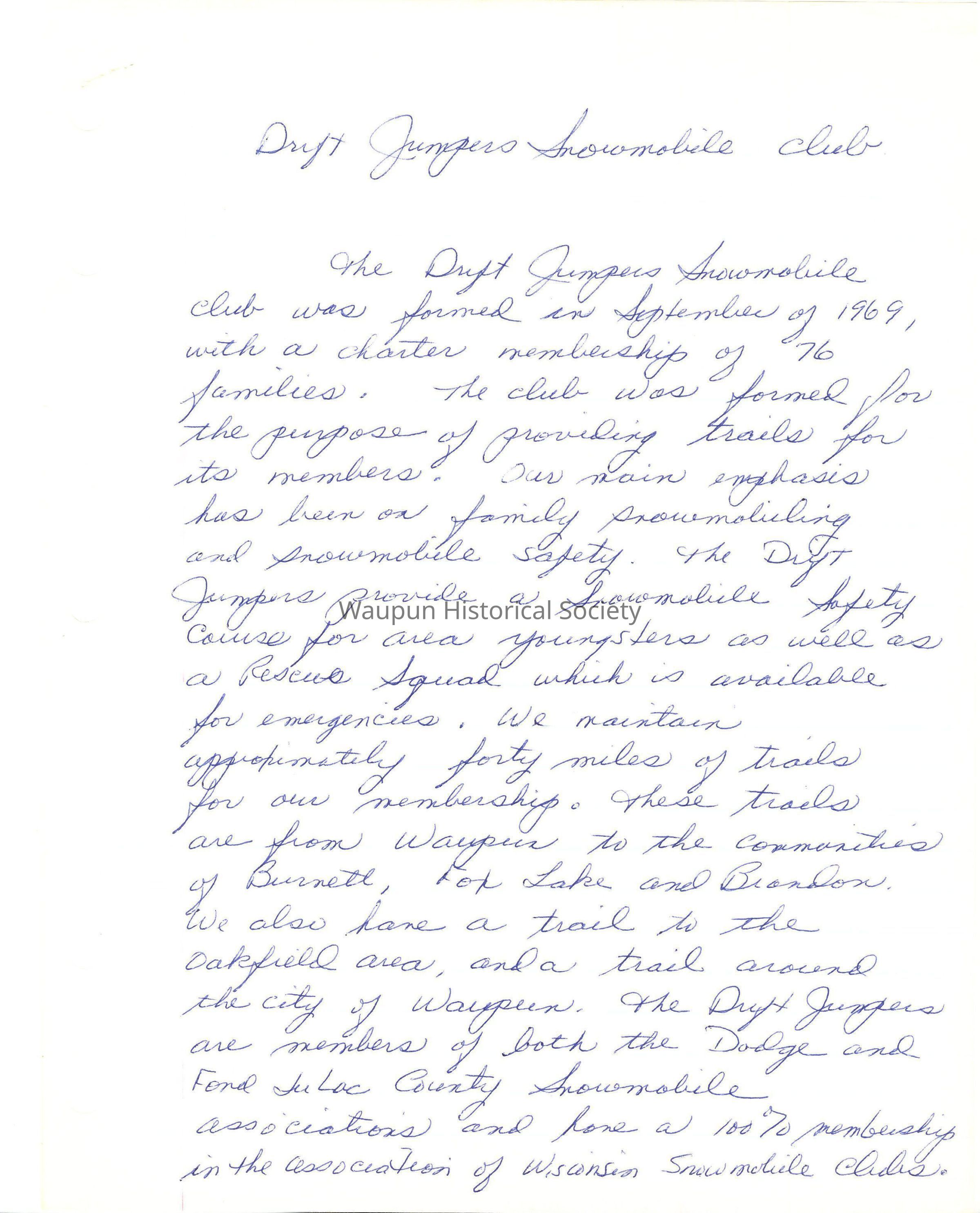 The Drift Jumpers Snowmobile Club was formed in September of 1969, with a charter membership of 76 families. The club was formed for the purpose of providing trails for its members. Our main emphasis has been on family snowmobiling and snowmobile safety. The Drift Jumpers provide a Snowmobile Safety cause for area youngsters as well as a Rescue Squad which is available for emergencies. We maintain approximately forty miles of trails for our membership. These trails are from Waupun to the communities of Burnett, Fox Lake and Brandon. We also have a trail to the Oakfield area, and a trail around the city of Waupun. The Drift Jumpers are members of both the Dodge and Fond du Lac County Snowmobile associations and have a 100% membership in the Association of Wisconsin Snowmobile Clubs.Acquisition