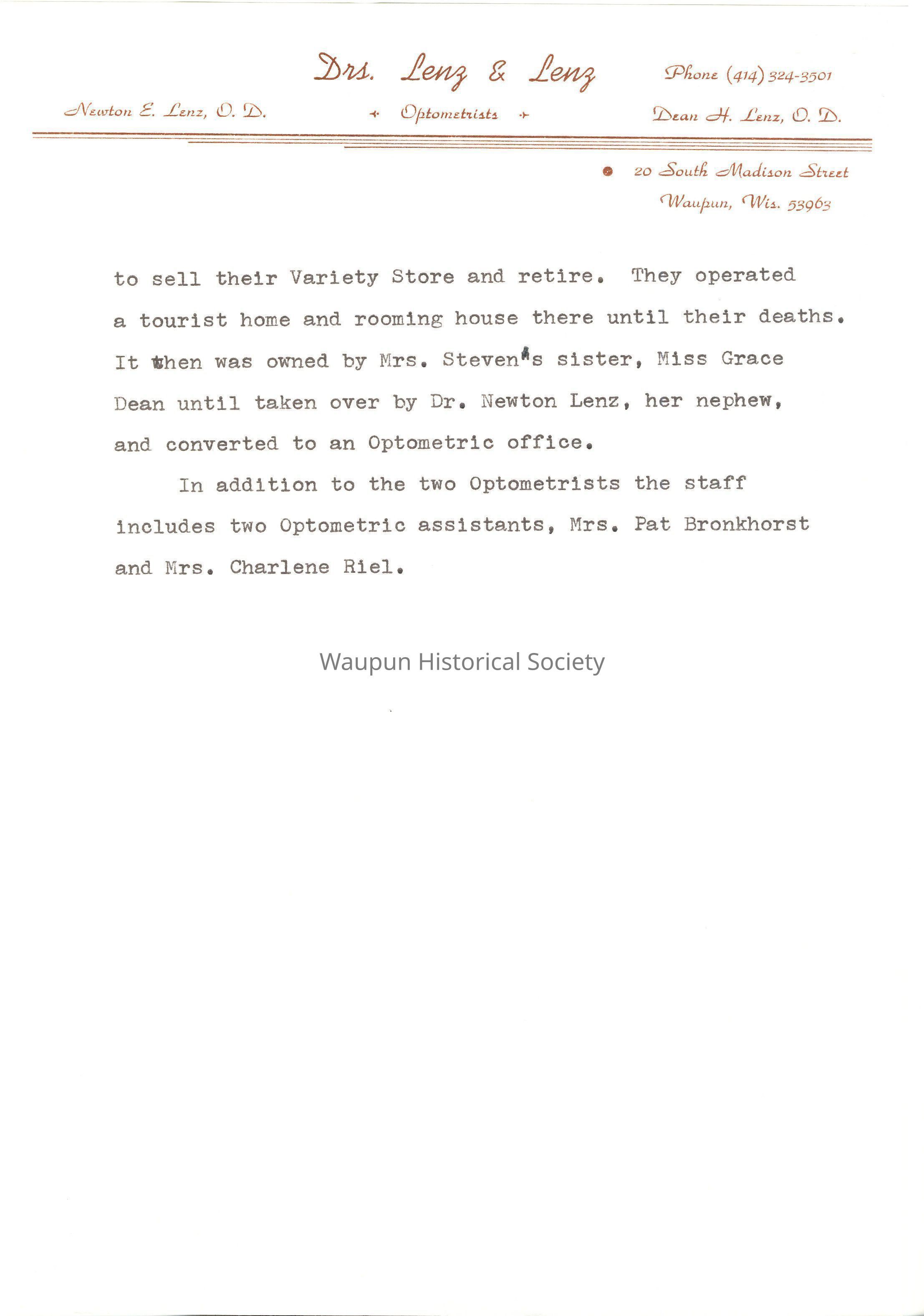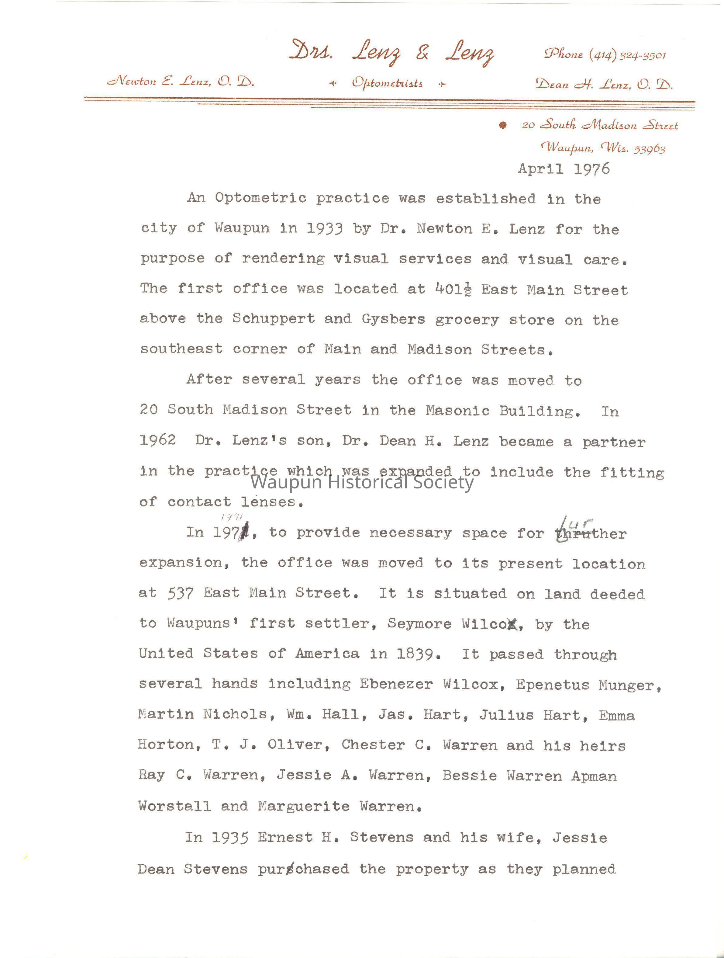 An Optometric practice was established in the city of Waupun in 1933 by Dr. Newton E. Lenz for the purpose of rendering visual services and visual care. The first office was located at 4011/2 East Main Street above the Schuppert and Gysbers grocery store on the southeast corner of Main and Madison Streets.