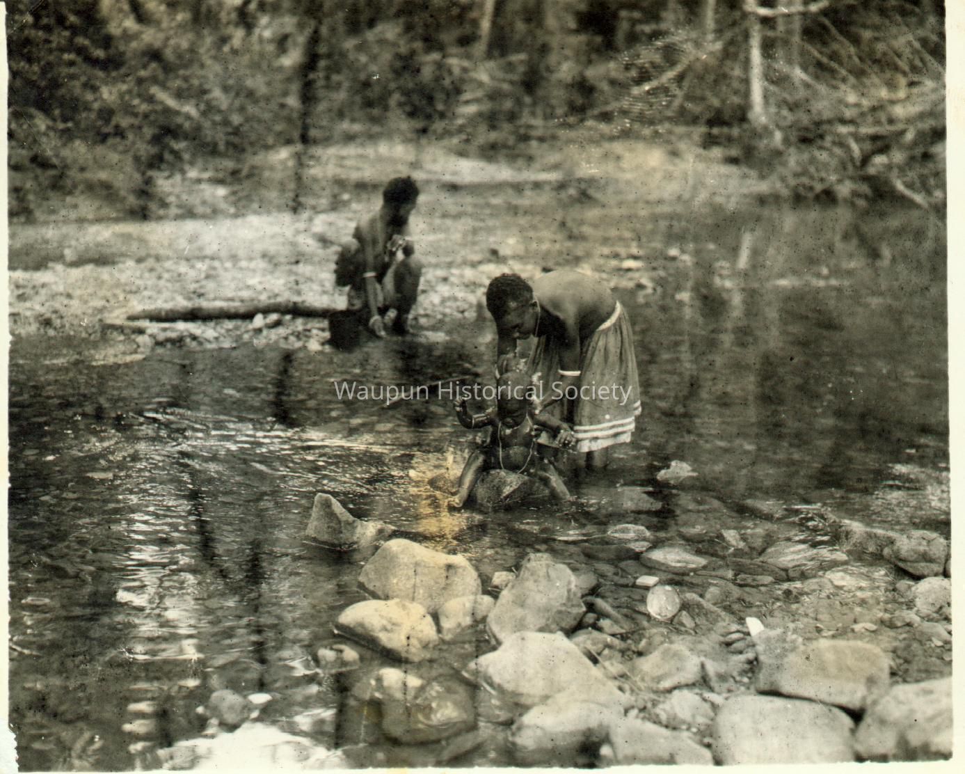 Mr. Walter Riel was a Sergeant with the 38th Photo Reconnaissance Squadron, 13th Air Force from 1942-1946. The Riel Collection is a series of photos that were given to the Waupun Historical Society by Mr. Riel. This photo shows New Guinea lady washing her baby.Acquisition