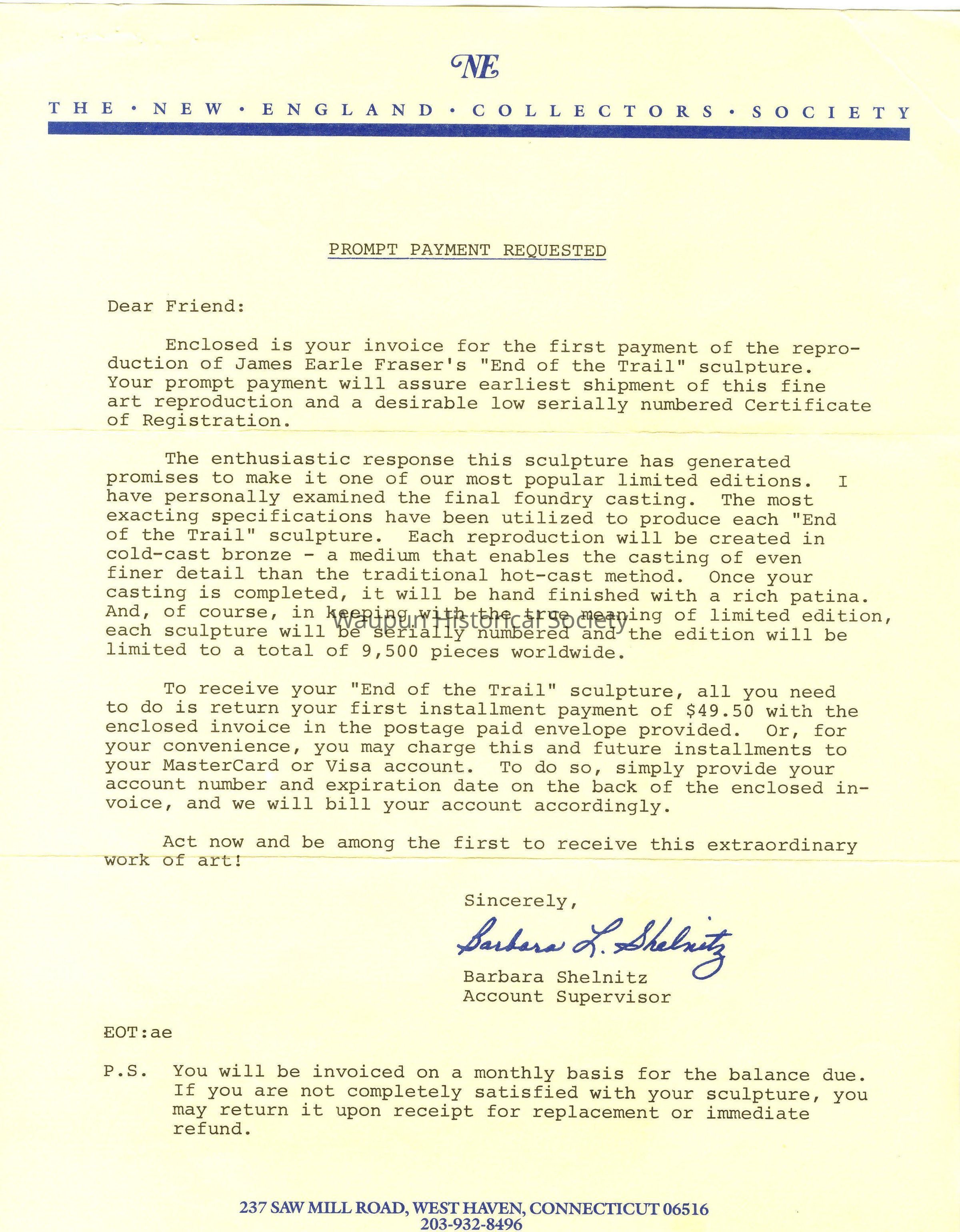 Letter from The New England Collectors Society regarding payment for reproduction of End of the Trial statue. The receipt for first payment is included.