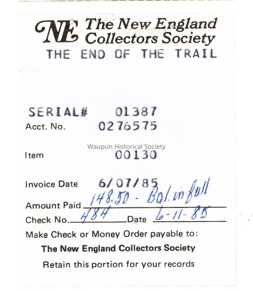 Letter to The New England Collectors Society regarding Certificate of Registration for the Limited First Edition statue of the End of the Trail, dated July 26, 1985. Also, a receipt of payment in full of $148.50, dated June 11, 1985 for invoice dated June 7, 1985.