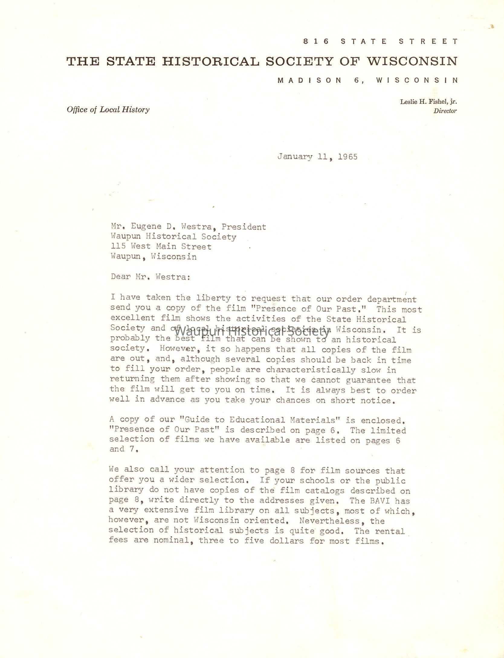 I have taken the liberty to request that our order department send you a copy of the film "Presence of Our Past." This most excellent film shows the activities of the State Historical Society and of local historical societies in Wisconsin. It is probably the best film that can be shown to an historical society. However, it so happens that all copies of the film are out, and, although several copies should be back in time to fill your order, people are characteristically slow in returning them after showing so that we cannot guarantee that the film will get to you on time. It is always best to order well in advance as you take your chances on short notice.
