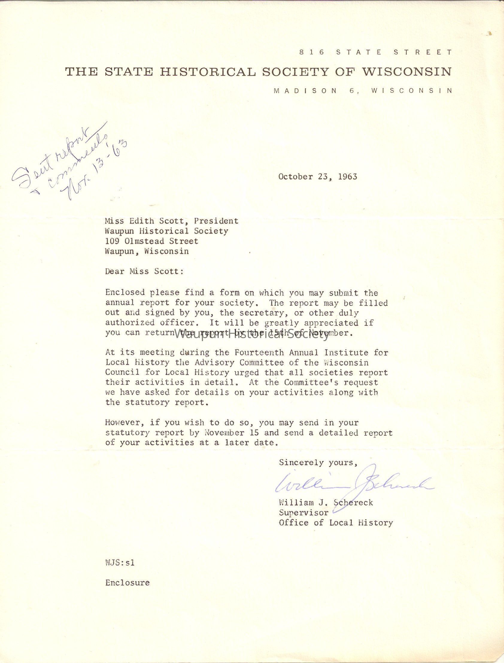 Enclosed please find a form on which you may submit the annual report for your society. The report may be filled out and signed by you, the secretary, or other duly authorized officer. It will be greatly appreciated if you can return the report by the 15th of November.
