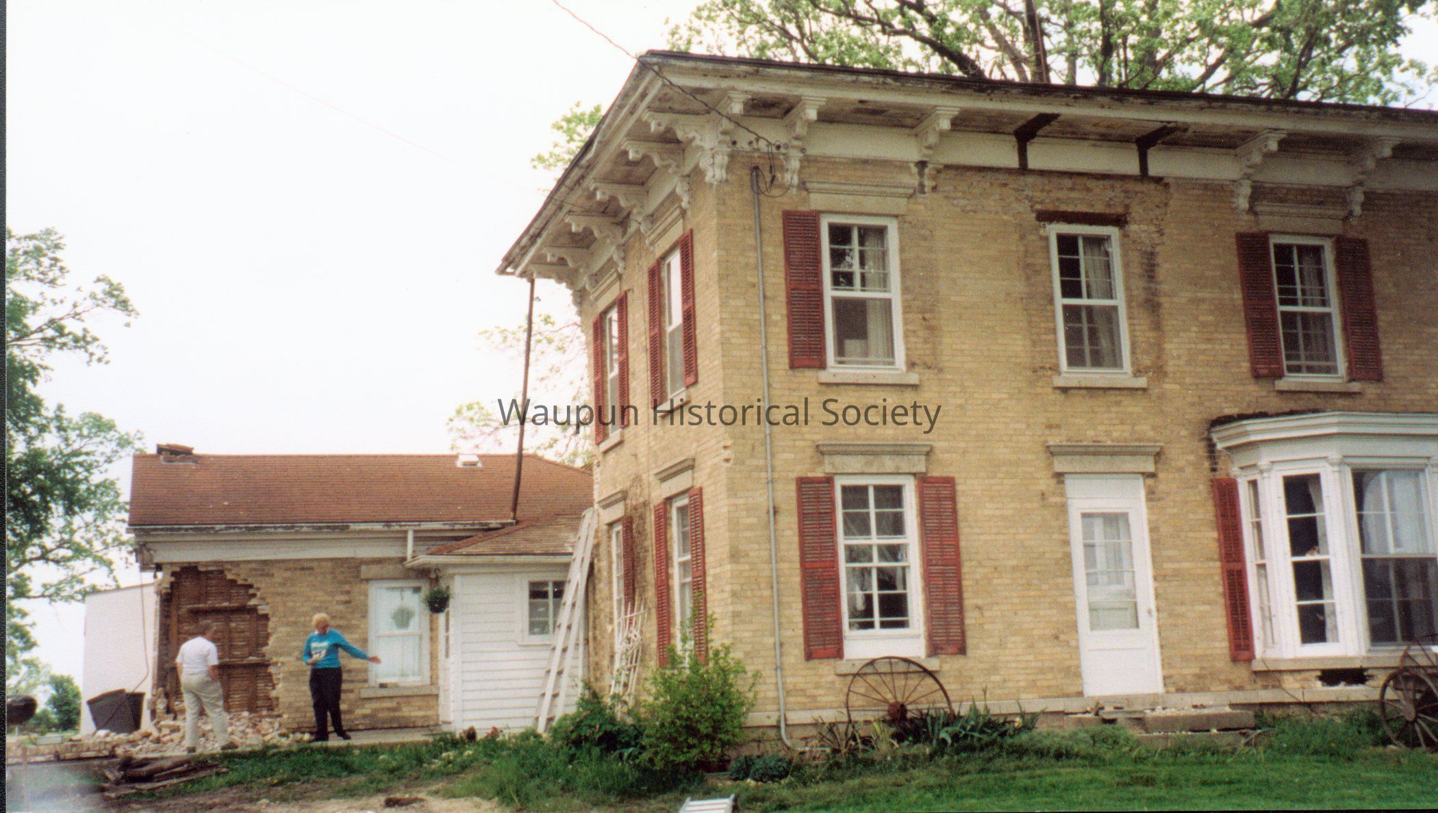 Photo Collection of the Ferguson Home: This photo shows the de-construction of the Ferguson home, Town of Chester, Dodge County, Wisconsin (on County MM just south of Waupun). The wooden portion of the home was built by David Ferguson, between April and winter of 1850, while the brick addition was added to the south end of the original home in 1860.