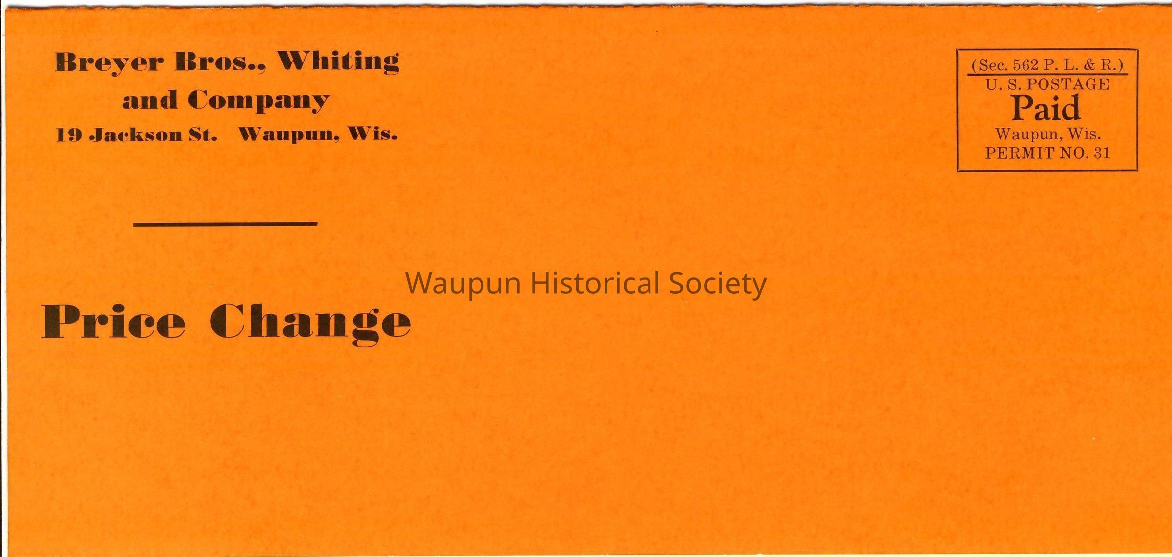 Price Change pamphlet in letter form from Breyer Bros., Whiting and Company, 19 Jackson St., Waupun, Wis.
